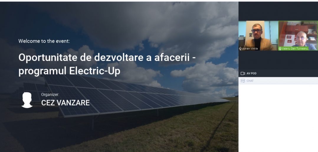 Pentru a sprijini business-urile locale, CEZ Vânzare organizează întâlniri online cu clienții în vederea promovării programului național Electric-UP. Astfel, aceștia au posibilitatea de a afla despre oportunitățile de dezvoltare a afacerii, prin prezentarea aspectelor legate de modalitatea de finanțare a proiectelor de investiții pentru reducerea costurilor. Suma cu care poate fi finanțat beneficiarul poate ajunge până la 100.000 EURO, beneficiarul nefiind nevoit să vină cu un aport propriu în cadrul programului.