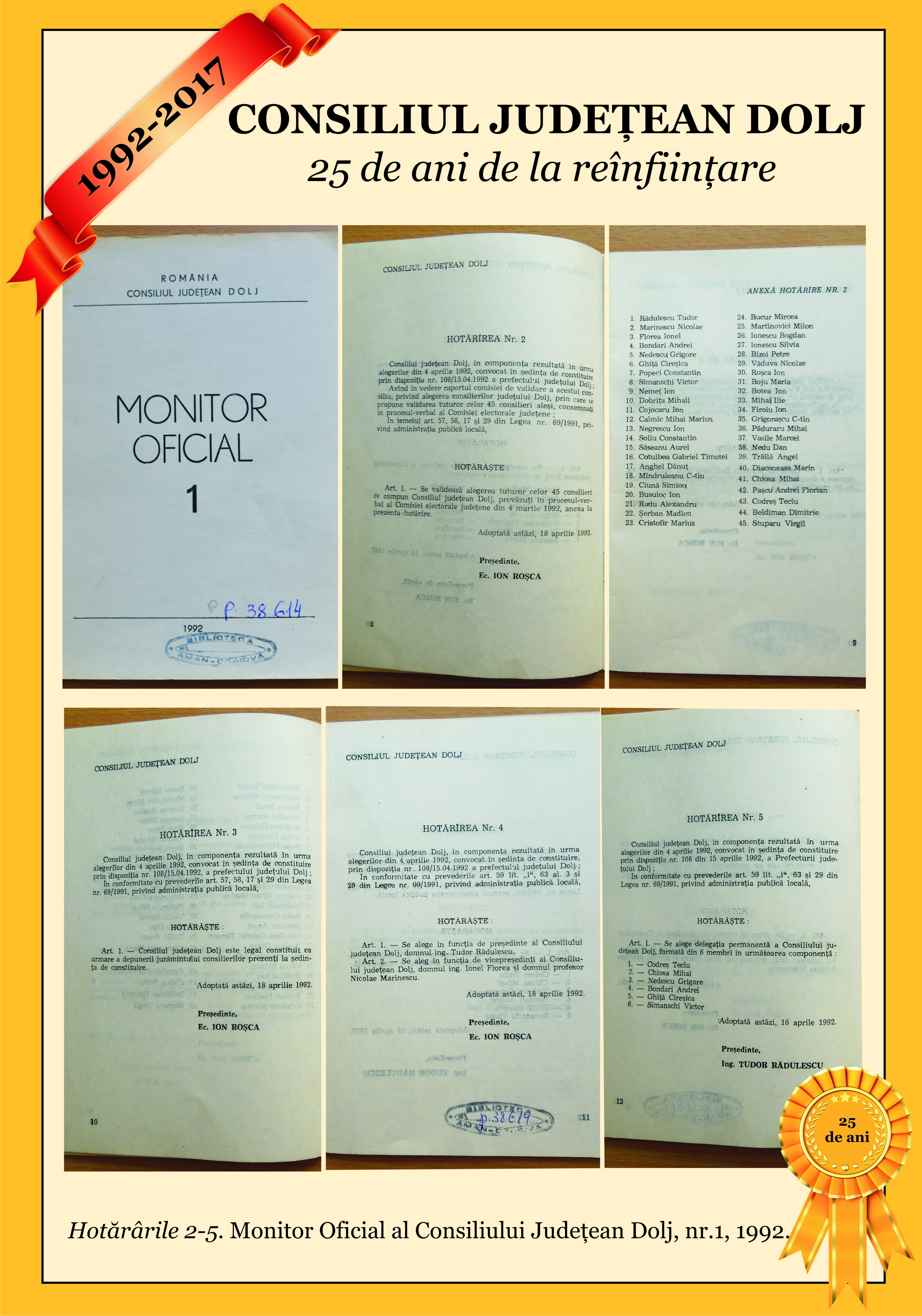 “Biblioteca Județeană Alexandru și Aristia Aman vernisează expoziția “Consiliul Județean Dolj – 25 de ani de la reînființare” cu scopul de a rememora importanța reînfințării celei mai importante instituții administrative care activează pe plan local, pe de o parte, dar și pentru a marca o cifră rotundă, un sfert de secol, deci, de la reluarea funcției vitale, democratice și reprezentative, a Consiliului Județean Dolj. La mulți ani Consiliului Județean Dolj și tuturor celor care, în decursul ultimilor 25 de ani, au făcut parte din această instituție”, a declarat Lucian Dindirică, managerul Bibliotecii Județene “Alexandru și Aristia Aman”.