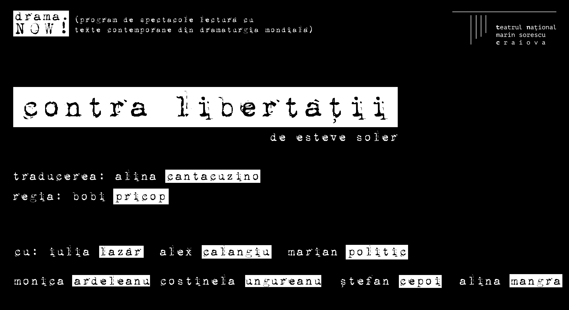 Teatrul Naţional din Craiova lansează programul drama.NOW! -trei spectacole-lectură cu texte contemporane din dramaturgia mondială, în fiecare stagiune.