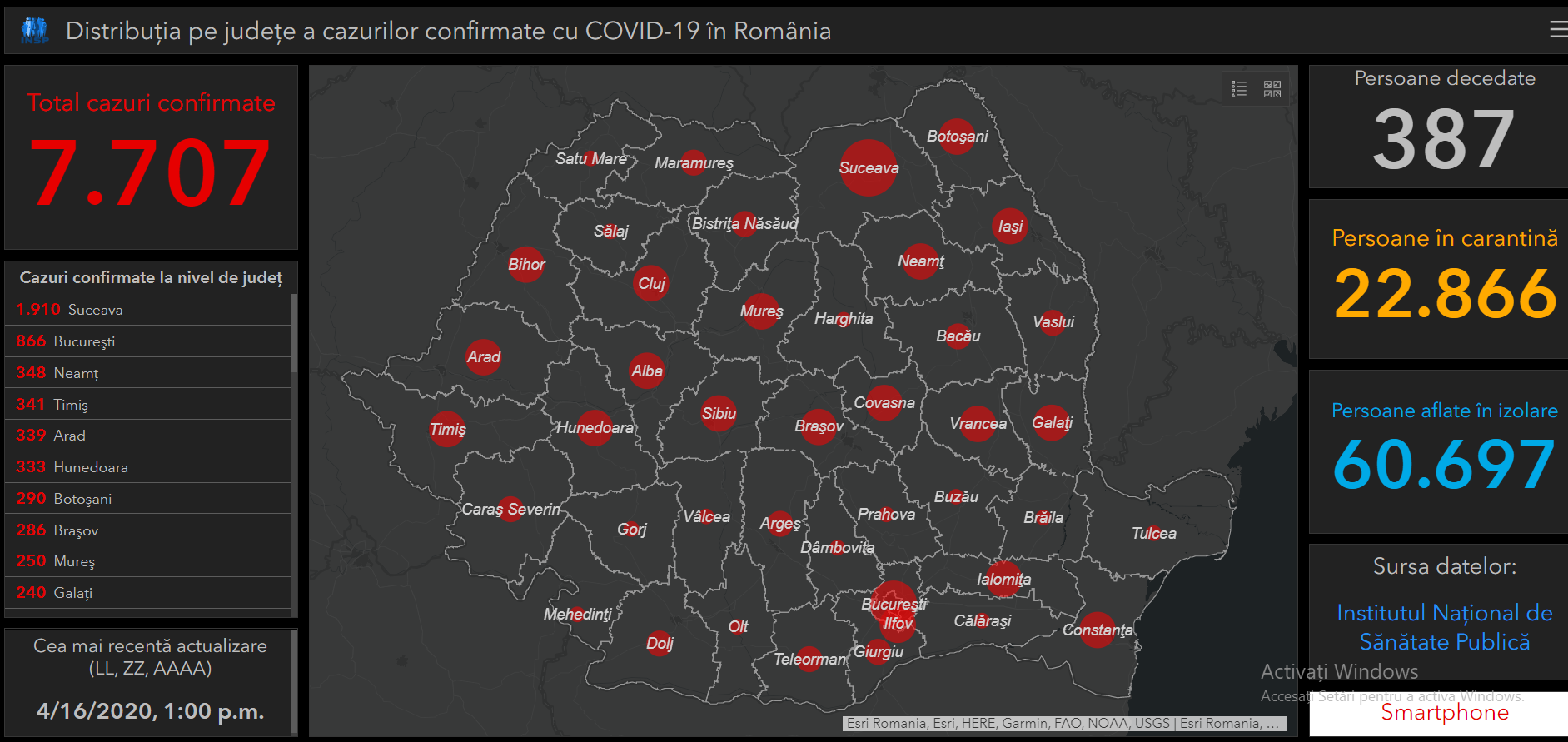 Până astăzi, 16 aprilie, pe teritoriul României, au fost confirmate 7.707 de cazuri de persoane infectate cu virusul COVID – 19 (). Dintre persoanele confirmate pozitiv, 1.357 au fost declarate vindecate și externate.