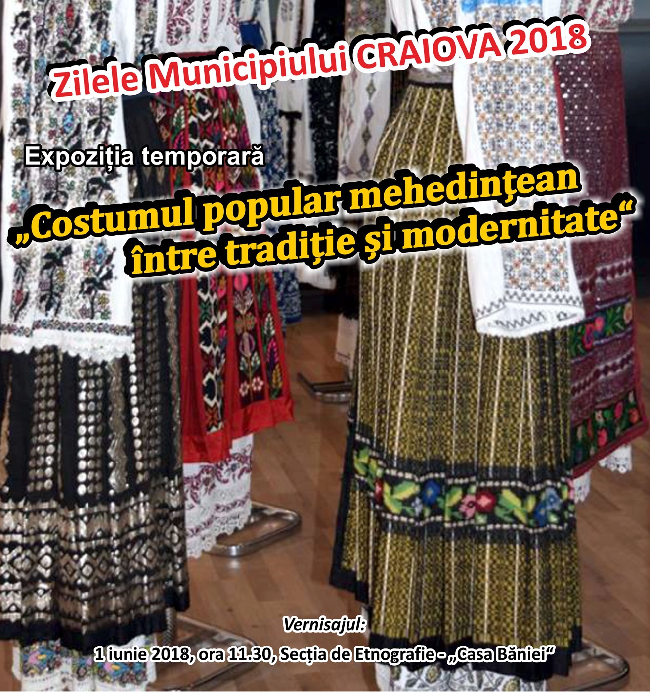 Secţia de Etnografie a Muzeului Olteniei Craiova organizează cu sprijinul Consiliului Judeţean Dolj, în parteneriat cu Consiliul Local Municipal și Primăria Municipiului Craiova, și, în colaborare cu Muzeul Regiunii Porţilor de Fier din Drobeta Turnu-Severin, cu prilejul evenimentului Zilele Municipiului Craiova, expoziția temporară, Costumul popular mehedinţean, între tradiţie şi modernitate.