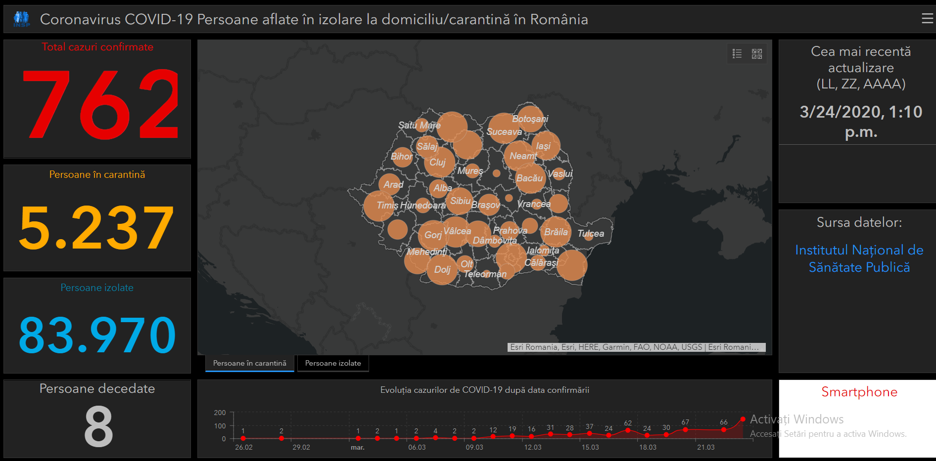 Până astăzi, 24 martie, pe teritoriul României, au fost confirmate 762 de cazuri de persoane infectate cu virusul COVID – 19 (coronavirus). Dintre cele 762 de persoane confirmate pozitiv, 79 au fost declarate vindecate și externate (53 la Timișoara, 19 la București, 3 la Craiova, 2 la Constanța, una la Cluj și una la Iași).