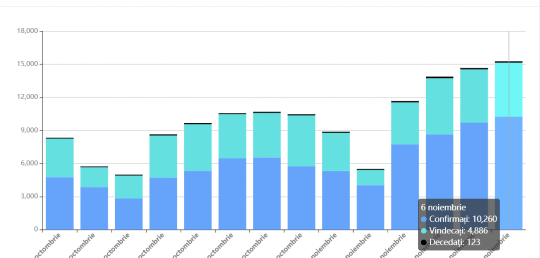 În intervalul 05.11.2020 (10:00) – 06.11.2020 (10:00) au fost raportate 123 decese (69 bărbați și 54 femei), ale unor pacienți infectați cu noul coronavirus, internați în spitalele din Alba, Arad, Argeș, Bacău, Bihor, Bistrița-Năsăud, Botoșani, Brăila, Brașov, Călărași, Caraș-Severin, Constanța, Covasna, Dâmbovița, Galați, Giurgiu, Gorj, Harghita, Hunedoara, Ialomița, Iași, Maramureș, Mehedinți, Mureș, Olt, Prahova, Sălaj, Sibiu, Suceava, Timiș, Tulcea, Vâlcea, Vaslui, Vrancea, Ilfov și Municipiul București.