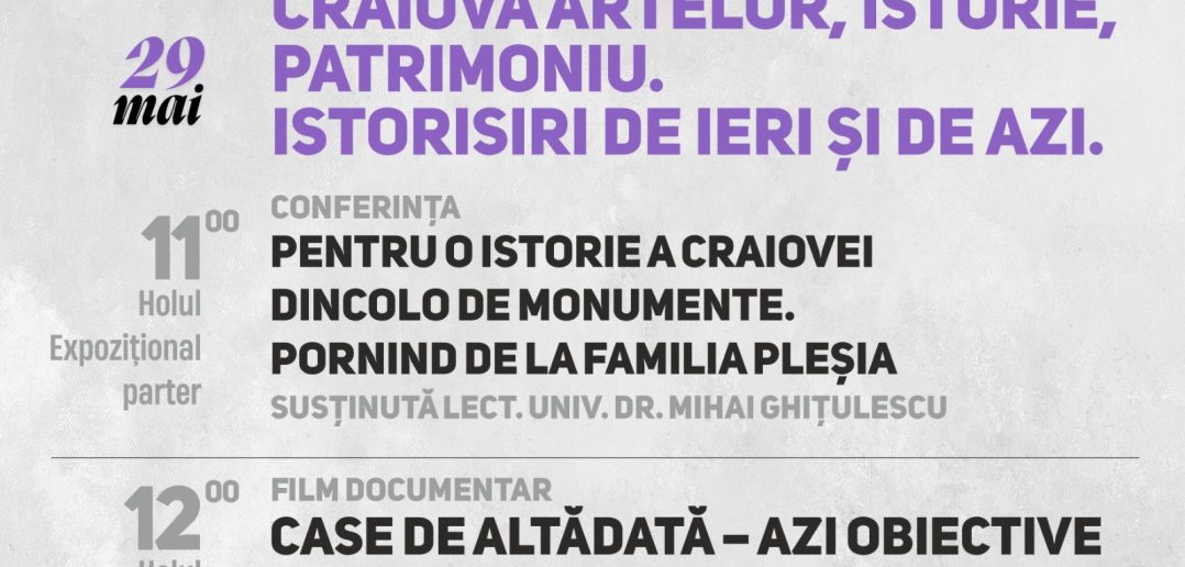 Prima secțiune a acestui eveniment, conferința „Pentru o istorie a Craiovei dincolo de monumente. Pornind de la familia Pleșia”, susținută de lect. univ. dr. Mihai Ghițulescu, va începe la ora 11.00 în Holul Expozițional al muzeului.