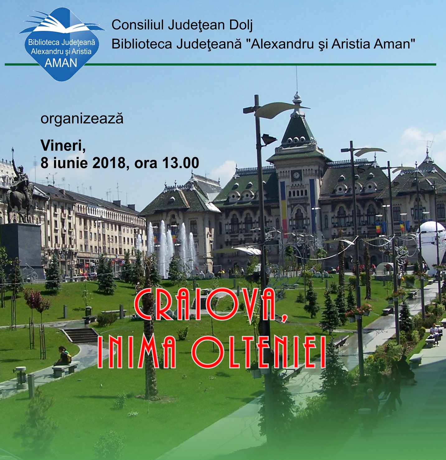 Biblioteca Județeană „Alexandru și Aristia Aman” organizează vineri, 8 iunie, începând cu ora 13:00, în sala „Adrian Păunescu”, proiectul cu titlul „Craiova, inima Olteniei”.