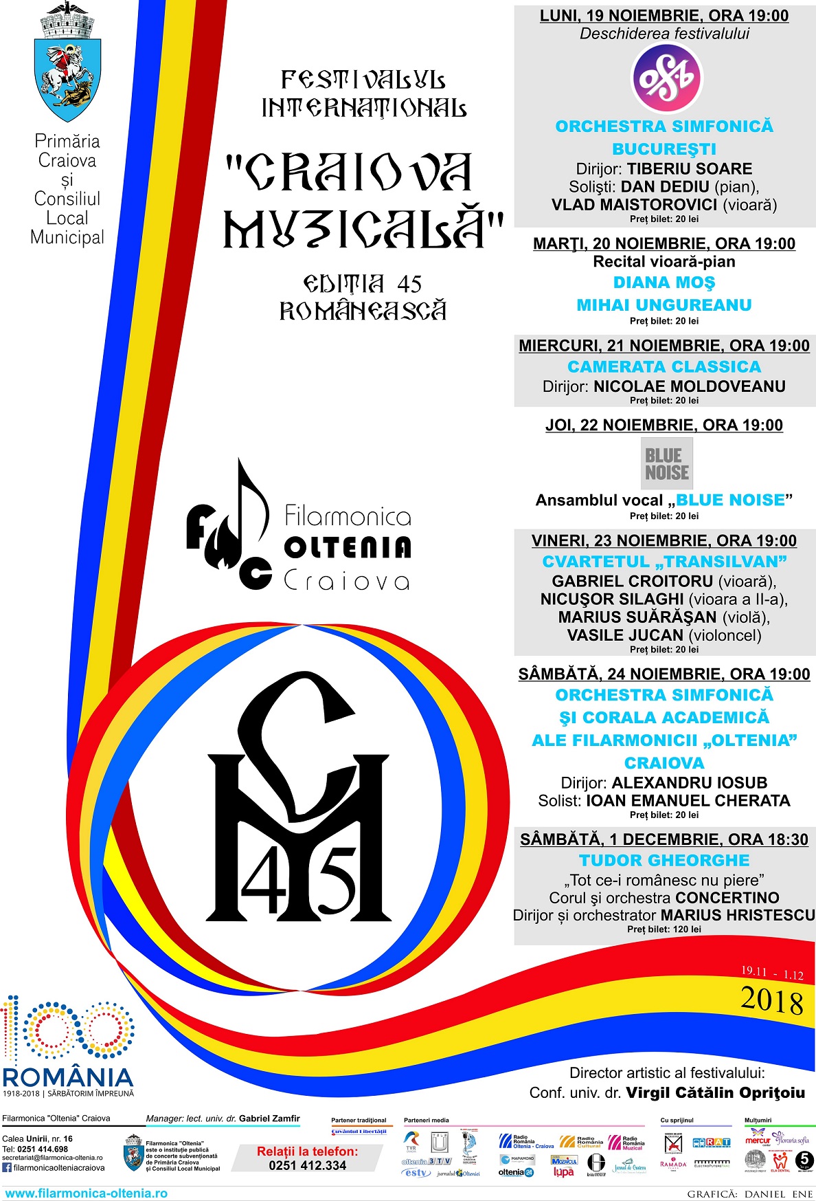 Festivalul Internaţional Craiova Muzicală, ajuns la ediţia nr. 45, propune aşadar, în anul 2018, o „radiografie” a muzicii româneşti alături de Orchestra Simfonică Bucureşti (dirijor Tiberiu Soare, solişti Dan Dediu-pian, Vlad Maistorovici-vioară), Duo vioară-pian Diana Moş/Mihai Ungureanu, Camerata Classica (dirijor Nicolae Moldoveanu), Ansamblul vocal „Blue Noise” (Veronica Prodan, Elena Moroşanu, Flavia Zoe, Mihail Grigore, Bogdan Tudor, Denis Bolborea), Cvartetul „Transilvan” (Gabriel Croitoru-vioară, Nicuşor Silaghi-vioara a II-a, Marius Suărăşan-violă, Vasile Jucan-violoncel), Orchestra Simfonică şi Corala Academică ale Filarmonicii „Oltenia” Craiova (dirijor Alexandru Iosub, solist Ioan Emanuel Cherata), Tudor Gheorghe&Corul şi orchestra „Concertino” (dirijor şi orchestrator Marius Hristescu).