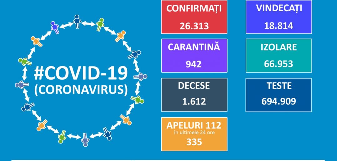 Până astăzi, 28 iunie, pe teritoriul României, au fost confirmate 26.313 cazuri de persoane infectate cu noul coronavirus (COVID – 19). Dintre persoanele confirmate pozitiv, 18.814 au fost declarate vindecate și externate.