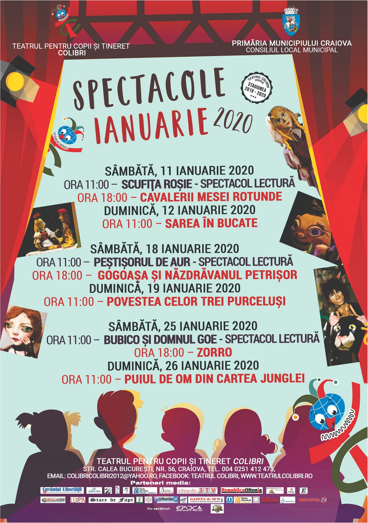 Teatrul pentru copii și tineret Colibri Craiova își așteaptă cu drag publicul începând de sâmbătă, 11 ianuarie 2020, ora 11:00, când este programat spectacolul – lectură Scufița Roșie, susținut de actorii Geo Dinescu și Marin Fagu, în Sala Studio. Prețul biletului pentru spectacolele – lectură este 10 lei / pers.