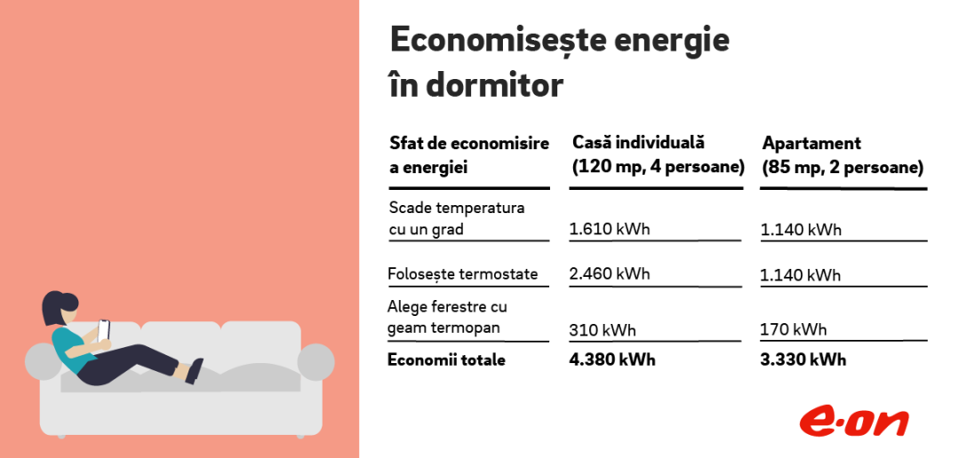 Cu fiecare grad mai puțin setat la termostat se reduce consumul de gaze naturale cu aproximativ 6%. Dacă optăm pentru ferestre cu geam termopan, folosim termostatul și scădem temperatura din dormitor cu doar 1°C, putem reduce consumul anual cu 3.330 kWh – în cazul unui apartament de 85 mp sau chiar cu 4.380 kWh – pentru o casă individuală de 120 mp. Acest lucru înseamnă o economie la bugetul familiei de 1.032,3 lei, respectiv de 1.357,8 lei.