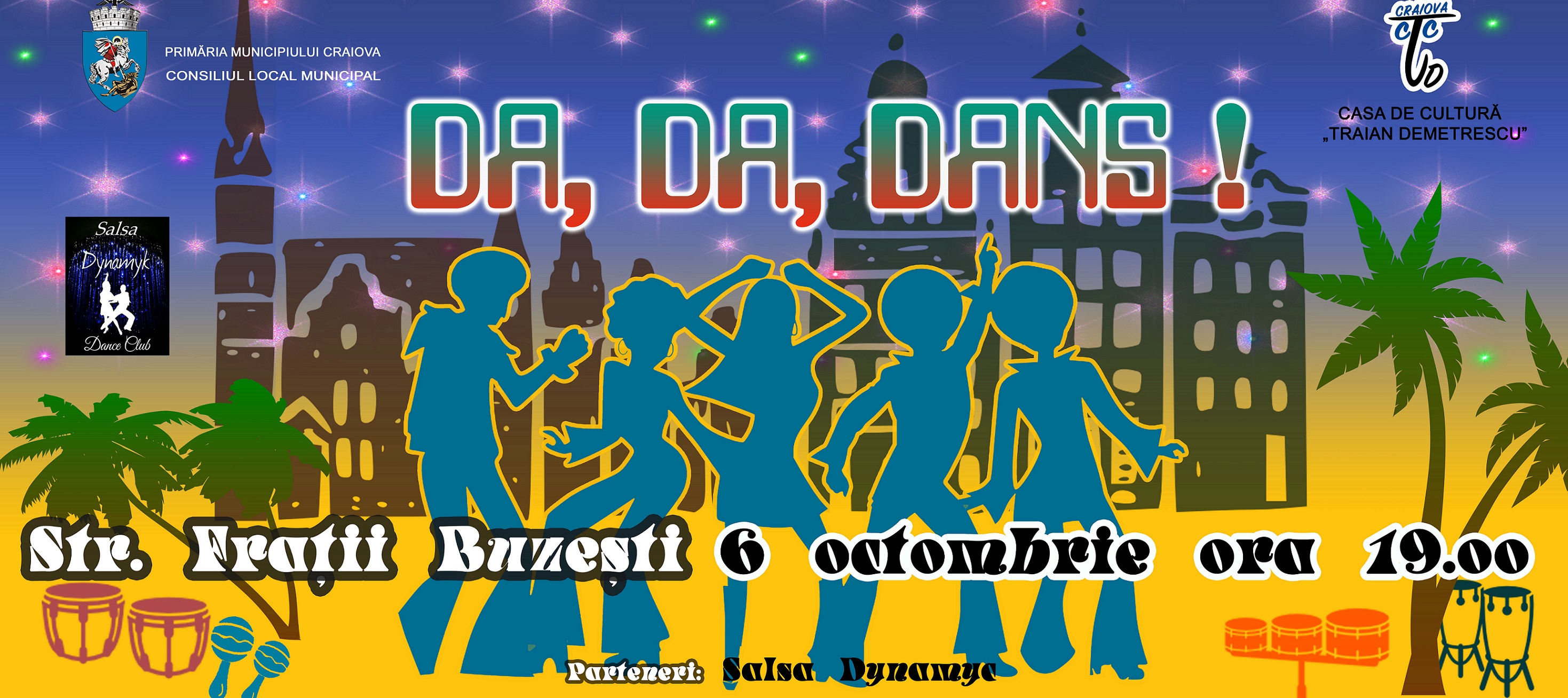 Vineri, începând cu ora 19:00, Casa de Cultură Traian Demetrescu vă aştepteaptă în Centrul Vechi, pe Strada „Fraţii Buzeşti”, pentru o seară de dans! Proiectul „Da, da, dans!” îşi propune să aducă în faţa publicului larg o manifestaţie interactivă în care, sub îndrumarea unor instructori coregrafi, craiovenii vor fi iniţiaţi în tainele dansului latino, învăţând paşii de bază ai salsa şi bachata.