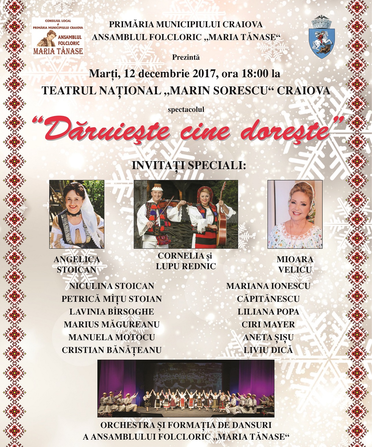 Ansamblul Folcloric „Maria Tănase” își așteaptă iubitorii muzicii folclorice la spectacolul „Dăruiește cine dorește”. Acesta se va desfășura marti, 12 decembrie, de la ora 18:00, la Teatrul National „Marin Sorescu” din Craiova.