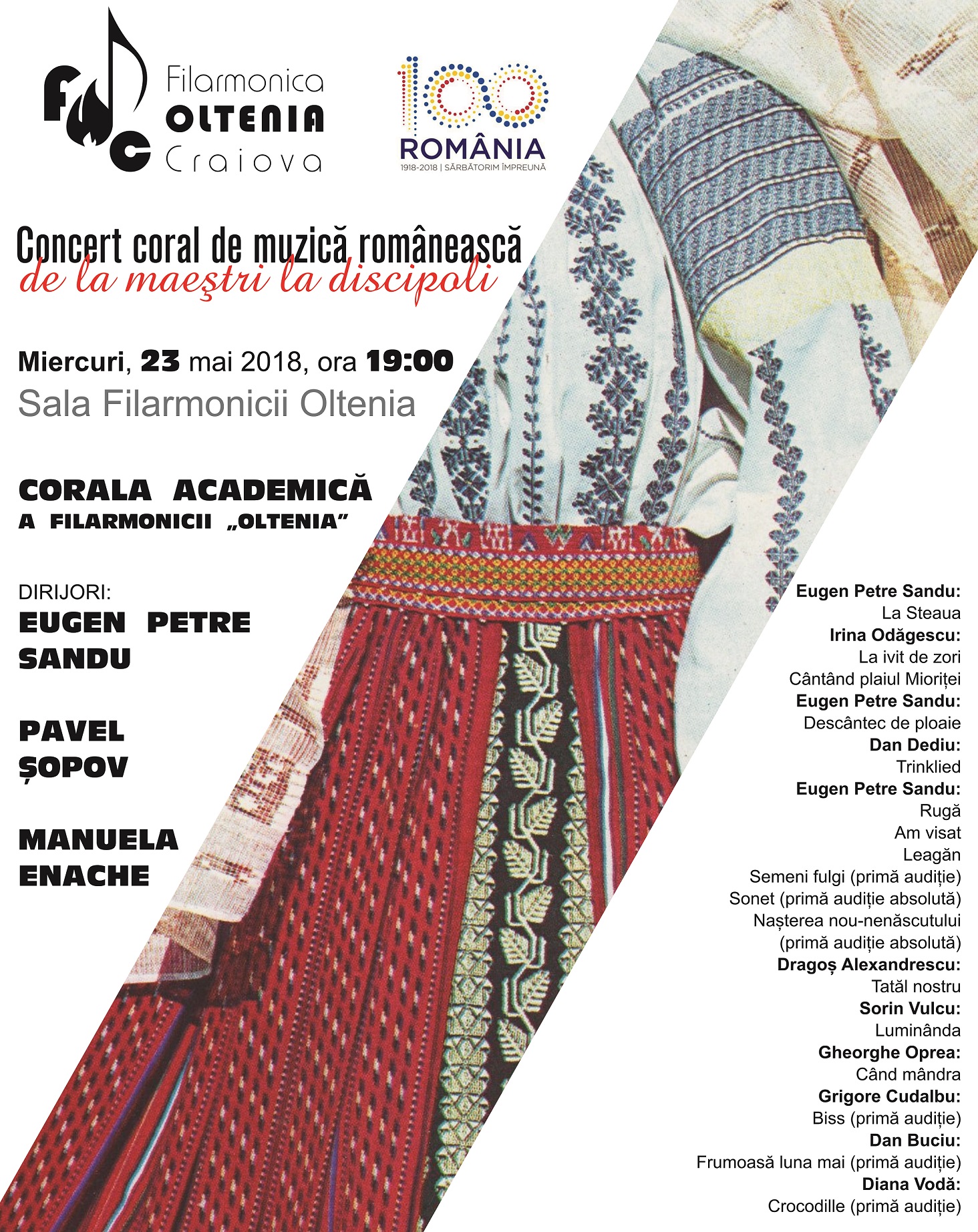 Miercuri, de la ora 19,00, iubitorii muzicii interpretate la cel mai sensibil instrument, vocea umană, sunt invitaţi să asculte un concert cu program integral românesc, multe lucrări fiind prezentate în primă audiţie. Corala Academică a Filarmonicii Oltenia Craiova va fi condusă muzical de trei dirijori, Eugen Petre Sandu, Pavel Şopov şi Manuela Enache, ceea ce se întâmplă rar într-un singur concert. „Evenimentul „De la maeştri, la discipoli” este un omagiu adus unor personalităţi ale vieţii muzicale româneşti, în anul Centenarului Marii Unirii, respectiv pe palierul muzicii corale naţionale. Am căutat să fie evindenţiate cele mai reprezentative figuri ale coralităţii româneşti, pornind de la Irina Odăgescu şi Dan Buciu, ajungând la regretaţii Sorin Vulcu, Dragoş Alexandrescu şi George Oprea. Aceştia şi-au pus amprenta asupra unoi noi generaţii de compozitori şi dirijori valoroşi care fac parte din acest program: Diana Vodă, Grigore Cudalbu şi Eugen Petre Sandu care, datorită preocupărilor plurivalente, au reuşit să se impună atât creativ, cât şi interpretativ, prin conducerea unor formaţii corale reprezentative în plan naţional şi european. Demersul gândit de mine este realizat alături de Pavel Şopov şi Manuela Enache, dirijorii permanenţi ai Coralei Academice şi de lect. univ. dr. Gabriel Zamfir, managerul Filarmonicii „Oltenia” Craiova”. (Eugen Petre Sandu)