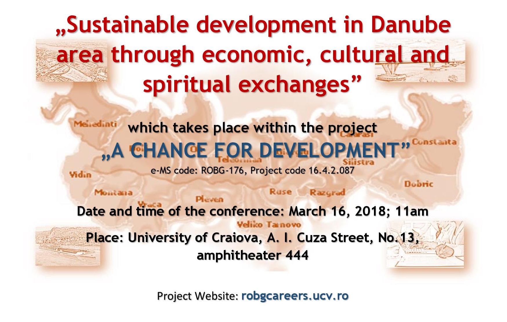 Universitatea din Craiova, în calitate de lider al proiectului „O șansă pentru dezvoltare”, organizează în data de 16 martie 2018, orele 11:00, la sala 444 conferința „Dezvoltare sustenabilă prin schimburi spirituale, culturale și economice”. Proiectul este implementat de către Universitatea din Craiova, în parteneriat cu Regional Development Foundation și Academia de Științe Economice D.A. Tsenov în perioada mai 2017- aprilie 2019 și este finanțat prin intermediul programului INTEREG V-A România-Bulgaria, axa prioritară 4.