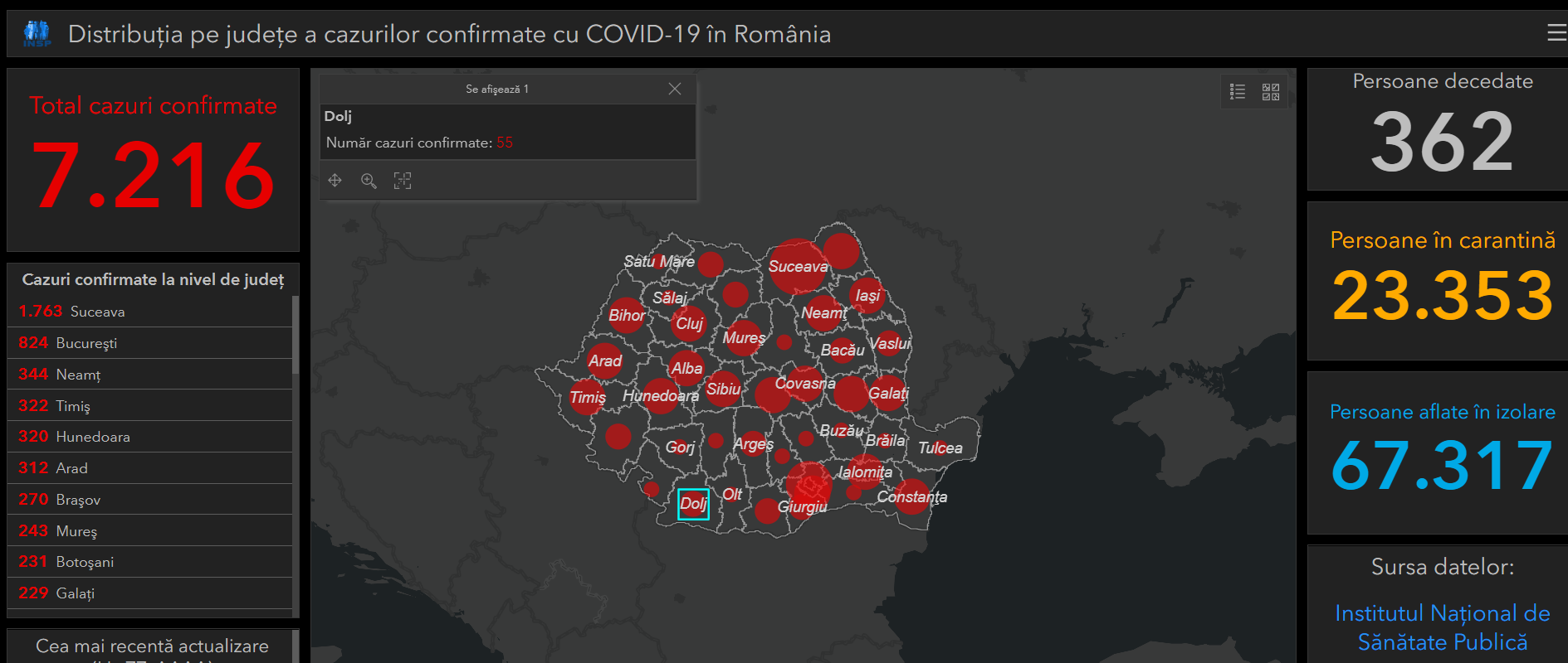 Astăzi 15.04.2020, ora 9.00, situația epidemiologică a județului Dolj se prezintă astfel: 1430 de persoane sunt izolate voluntar la domiciliu, 791 de persoane se află în carantină, 1035 de persoane au ieșit din carantină, iar alte 8238 au ieșit din izolare voluntară la domiciliu. Persoanele izolate la domiciliu sunt clinic sănătoase și nu prezintă simptomatologie specifică afectării de către virusul COVID-19.