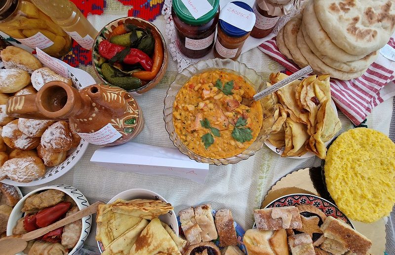 Pe mesele cu bucate se vor regăsi printre altele pâine-n țăst, turte coapte și prăjite, prăjituri, dulcețuri, vin, țuică și rachiu, raci umpluți, ouă roșii, brânză, platouri țărănești cu șunculiță, ceapă și usturoi verde, ajvar, păstrăv ca la Ohrid, orez la tuci, gogoși picate, pui copt pe pâine, sarmale cu nuci și stafide, mâncare de prune, lutiniță, saramură de pește, jumări, mămăligă, carne la garniță, păpuși de dragavei, cozonaci, sarmale, boabe fierte, ouă pe plită, friptură țărănească cu urez în tavă de pământ, pește uscat în șir, fript pe plită, cu mămăligă rece, pâine în ceaon (cococi), turte cu usturoi, fasole cu ciolan, ghiveci la cuptor în tuci, prăjitură-n foi, friptură de miel la cuptor, bureți scăzuți, salată de vinete, salată de fasole galbenă, prăjitură faguri, plăcinte cu mere, sărățele cu brânză, cornulețe cu gem, raci umpluți cu praz pe pat de orez, lapte covăsit, urdă, gogoși cu brânză și mărar, zaibăr etc.