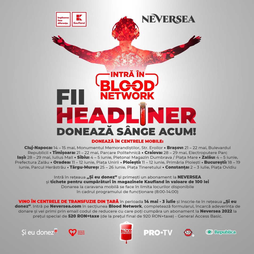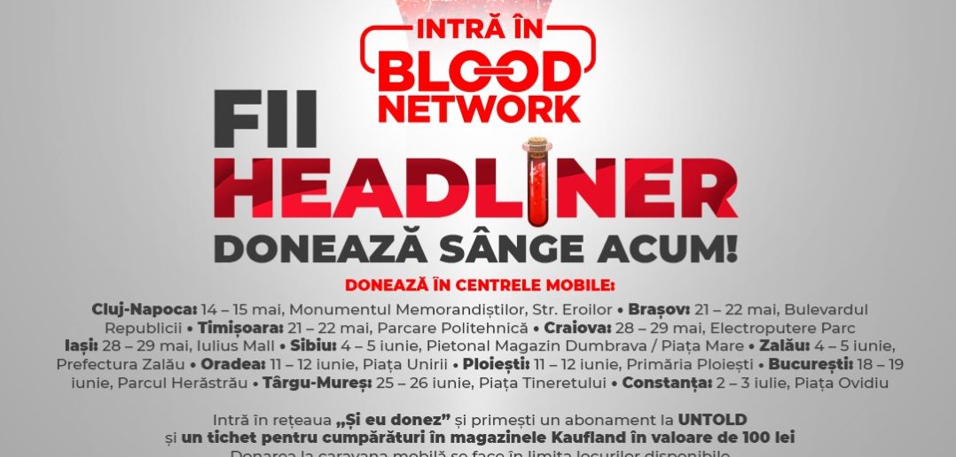 Caravana mobilă de donare de sânge BLOOD NETWORK ajunge în acest weekend la Craiova. Sâmbătă, 28 mai și duminică, 29 mai cei care vor să vină să salveze vieți și să se bucure de experiențe de neuitat la UNTOLD și Neversea sunt așteptați la donare la Mall Electroputere. În premieră anul acesta, cei care donează sânge la caravana mobilă BLOOD NETWORK, între orele 8:00 și 14:00, și se înscriu în baza de date “Și Eu Donez” vor primi un abonament gratuit la UNTOLD sau Neversea, iar cei care donează în centrele de transfuzii primesc un voucher de reducere pentru achiziționarea abonamentului la festival. Donarea la caravana mobilă se face în limita locurilor disponibile.