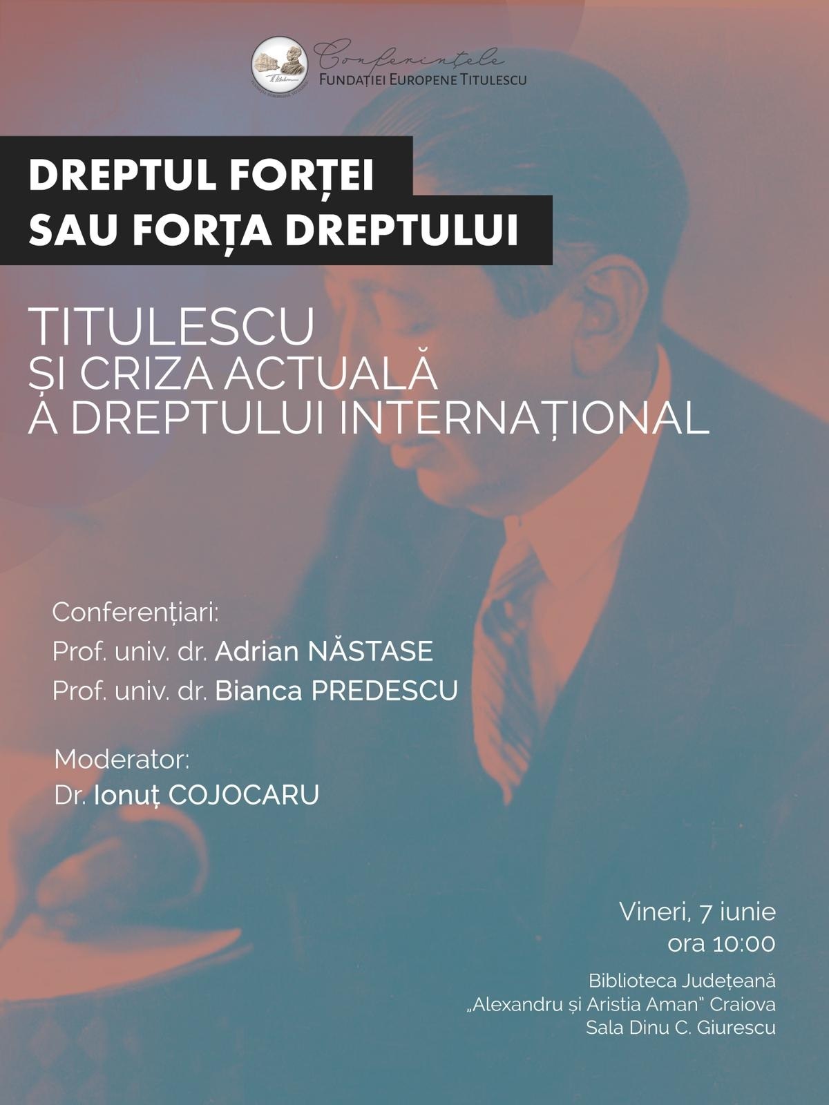 Biblioteca Județeană „Alexandru și Aristia Aman” găzduiește vineri, 7 iunie 2019, începând cu ora 10:00, în sala „Acad. Dinu C. Giurescu”, conferința cu tema „Dreptul forței sau forța dreptului? Titulescu și criza actuală a dreptului internațional”, susținută de prof.univ.dr. Adrian Năstase, președintele Fundației Europene Titulescu.