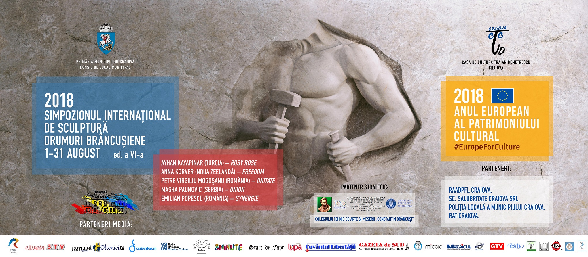 Simpozionul Internaţional de Sculptură “Drumuri Brâncuşiene”, ediţia a VI-a, va reuni la Craiova în perioada 1-31 august, artişti din toată lumea care vor realiza 5 creaţii de sculptură din piatră. Tema de anul acesta este Momentul istoric al Marii Uniri de la 1918.