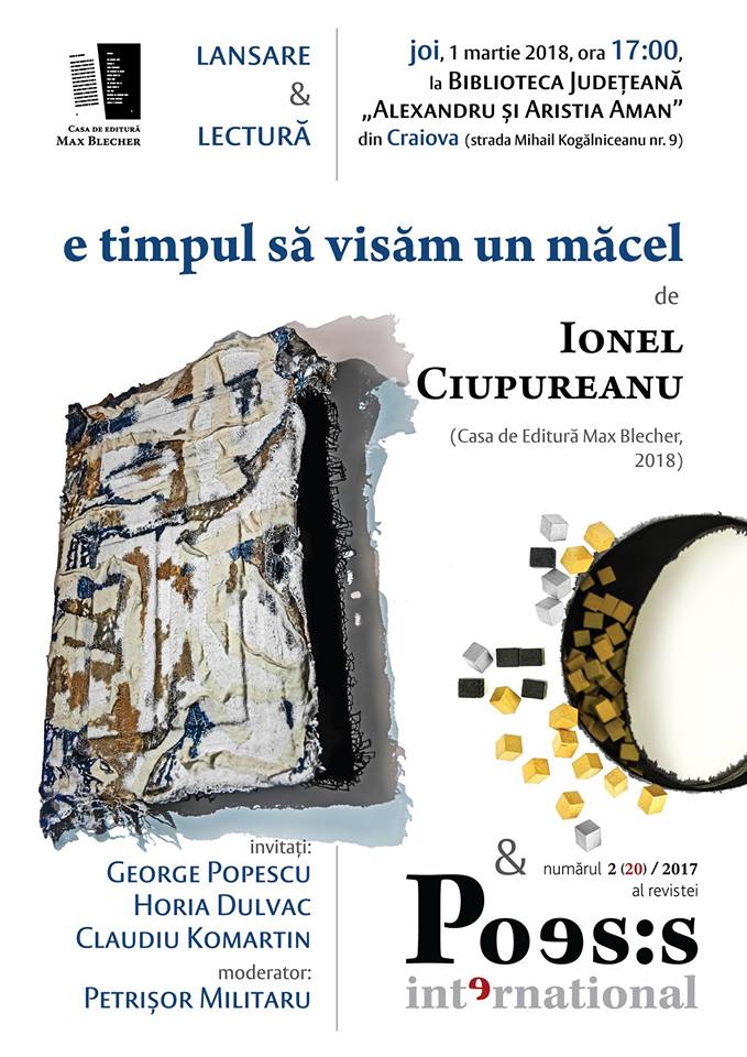 Biblioteca Județeană “Alexandru și Aristia Aman” găzduiește joi, în sala “Acad. Dinu. C. Giurescu”, începând cu ora17,00, lansarea volumului „e timpul să visăm un măcel”, autor Ionel Ciupureanu, precum și lansarea numărului 20 al revistei „Poesis internațional”. Moderatorul evenimentelor va fi Petrișor Militaru.
