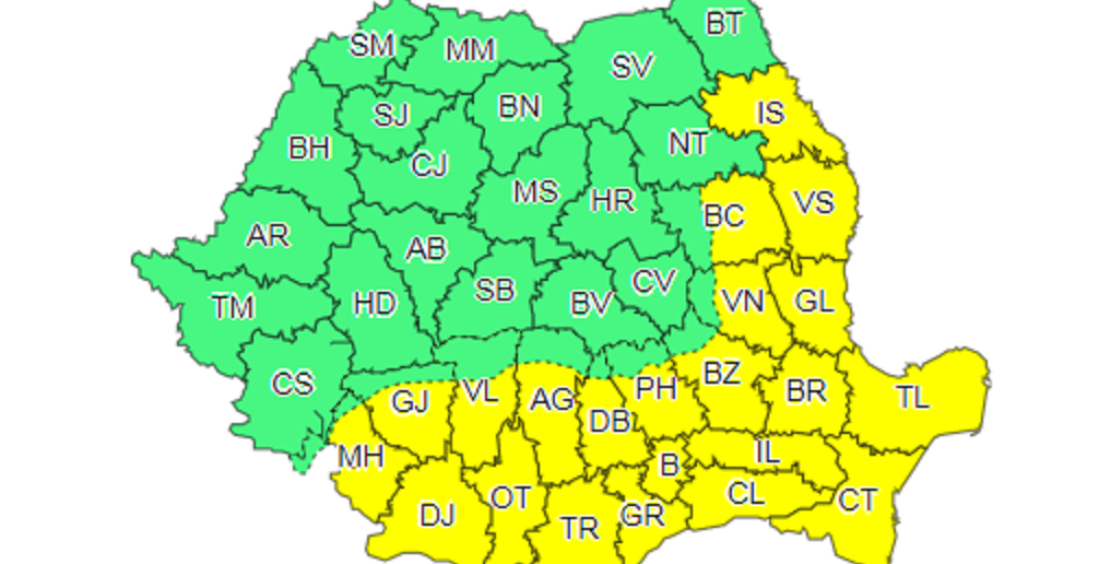 Administrația Națională de Meteorologie a emis, marți, o aversizare Cod Galben pentru aproape jumătate de țară. Acesta este valabil începând din această dimineață, de la orele 10.00 până joi seara, în jurul orelor 20,00.