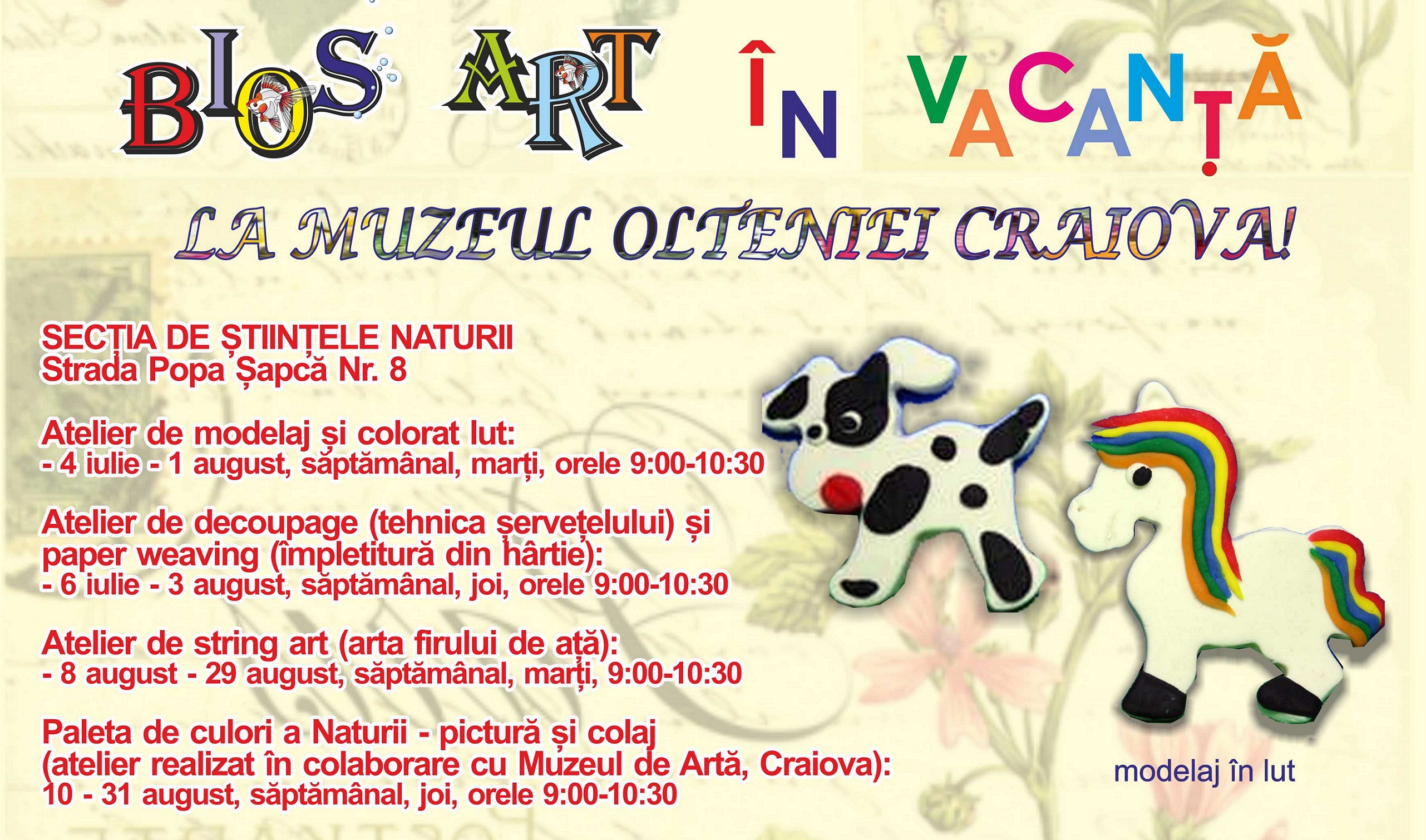 3. Secția de Științele Naturii organizează patru ateliere creative în cadrul Școlii de Vară ”Bios Art în vacanță” abordând următoarele tehnici:atelier de modelaj și colorat lut (perioada, 4 iulie-1 august), se va derula săptămânal marțea, în intervalul orar 09.00 – 10.30; atelier de decoupage (tehnica șervețelului) și paper weaving -împletitură din hartie (perioada, 6 iulie – 3 august), se va derula săptămânal, joia, în intervalul orar 09.00 – 10.30; atelier de string art/arta firului de ață, (perioada 8 – 29 august), se va derula săptămânal, marțea, în intervalul orar 09.00 – 10.30; atelierul „Paleta de culori a Naturii – pictură și colaj”(realizat în colaborare cu Muzeul de Artă Craiova, în perioada 10 – 31 august), se va derula săptămânal, joia, în intervalul orar 09.00 – 10.30. Specialistul din partea Muzeului de Artă Craiova care îi va îndruma pe cei mici în lumea culorilor și a artei, este muzeograf Rusalia Crăciunoiu.