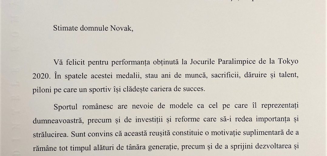 Ministrul în funcție al Tineretului și Sportului a fost felicitat de către președintele României pentru performanțele obținute în cadrul Jocurilor Pralimpice de la Tokyo.