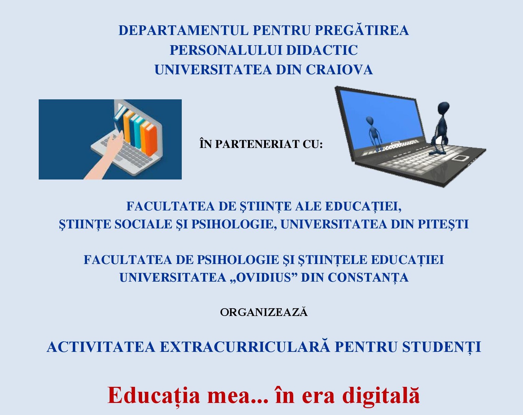 Departamentul pentru Pregătirea Personalului Didactic (DPPD) al Universității din Craiova organizează, în perioada 19-21 aprilie 2019, workshop-ul „Educația mea…în Era Digitală”.