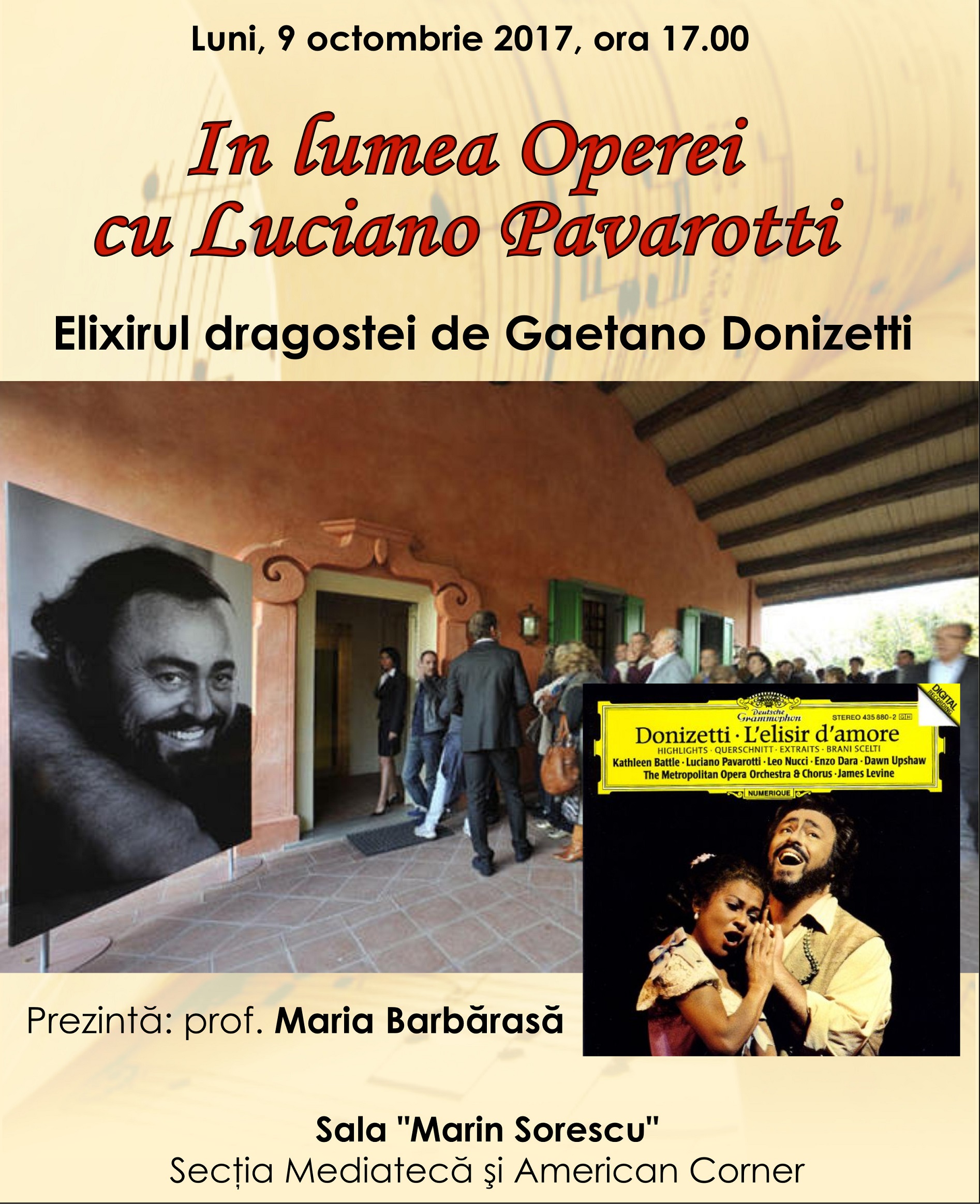 Pentru ca in acest an se implinesc 10 ani de la disparitia marelelui solist de opera Luciano Pavarotti, la cererea publicului meloman, se va difuza inregistrarea de la Metropolitan Opera, din anul 1992, a spectacolului  “Elixirul Dragostei” (“L’Elisir D’Amore”), de Gaetano Donizetti, cu marele tenor in rolul principal. Evenimetul își propune promovarea muzicii clasice și readucerea marelui solist în memoria colectivă.