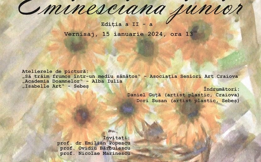 Expoziția „Eminesciana junior“ – ediția a II-a cuprinde picturi realizate de copii în cadrul programului de inițiere în artă „Să trăim frumos într-un mediu sănătos“, derulat de Asociația Seniori Art Craiova în parteneriat cu Centrul Judeţean pentru Conservarea şi Promovarea Culturii Tradiţionale Dolj, sub îndrumarea lui Daniel Guță – artist plastic, precum și în cadrul atelierelor „Academia Doamnelor“ din Alba Iulia și „Isabelle Art“ din Sebeș, coordonate de artistul plastic Dori Susan. Din 8 ianuarie s-au reluat atelierele cu copiii în Galeriile „Cromatic“, acestea urmând să fie finalizate cu o expoziție în luna martie. Până atunci, putem admira lucrările din expoziția „Eminesciana junior“ – ediția a II-a, care va fi deschisă în perioada 15 ianuarie – 29 februarie 2024.