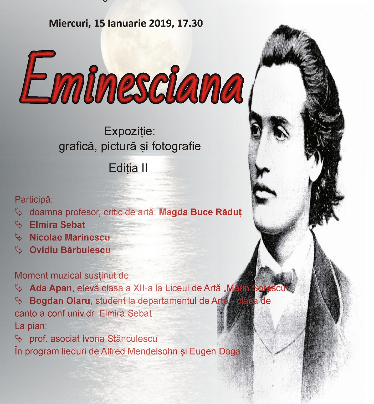 În prezența invitaților Nicolae Marinescu, Ovidiu Bărbulescu și Elmira Sebat, artiștii Cristofir Ana Maria, Dobrin Albert, Gaşpar Lidia, Grădinaru Florin, Ionescu Liana, Rădulescu Gabriela, Sălcianu Nela Marinela, Scarlat Ileana Claudia, Stoian Cosmin, Scurtu Dan, Panait Bogdan și Goanţă Sorin, din grupul artiștilor plastici Art Amicis, vor expune lucrări ce ilustrează versuri semnate de poetul Mihai Eminescu. Prezentarea lucrărilor va fi realizată de prof. Magda Buce Răduț.