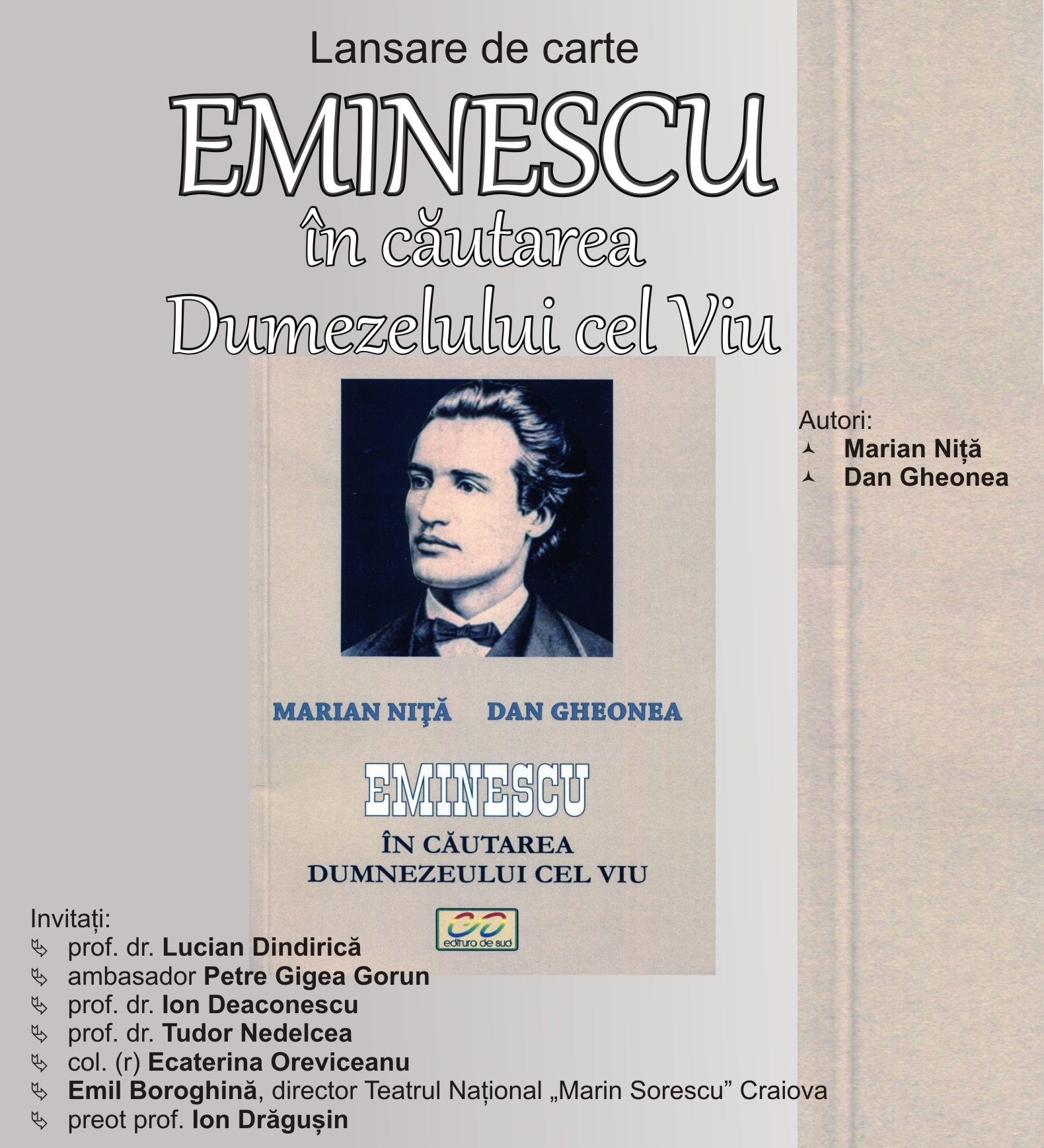 Biblioteca Județeană “Alexandru și Aristia Aman” organizează miercuri, 13.06.2018, începând cu ora 18:00, în sala “Acad. Basarab Nicolescu”, lansarea volumului „Eminescu în căutarea Dumnezeului cel viu”, autori Marian Niță și Dan Gheonea.