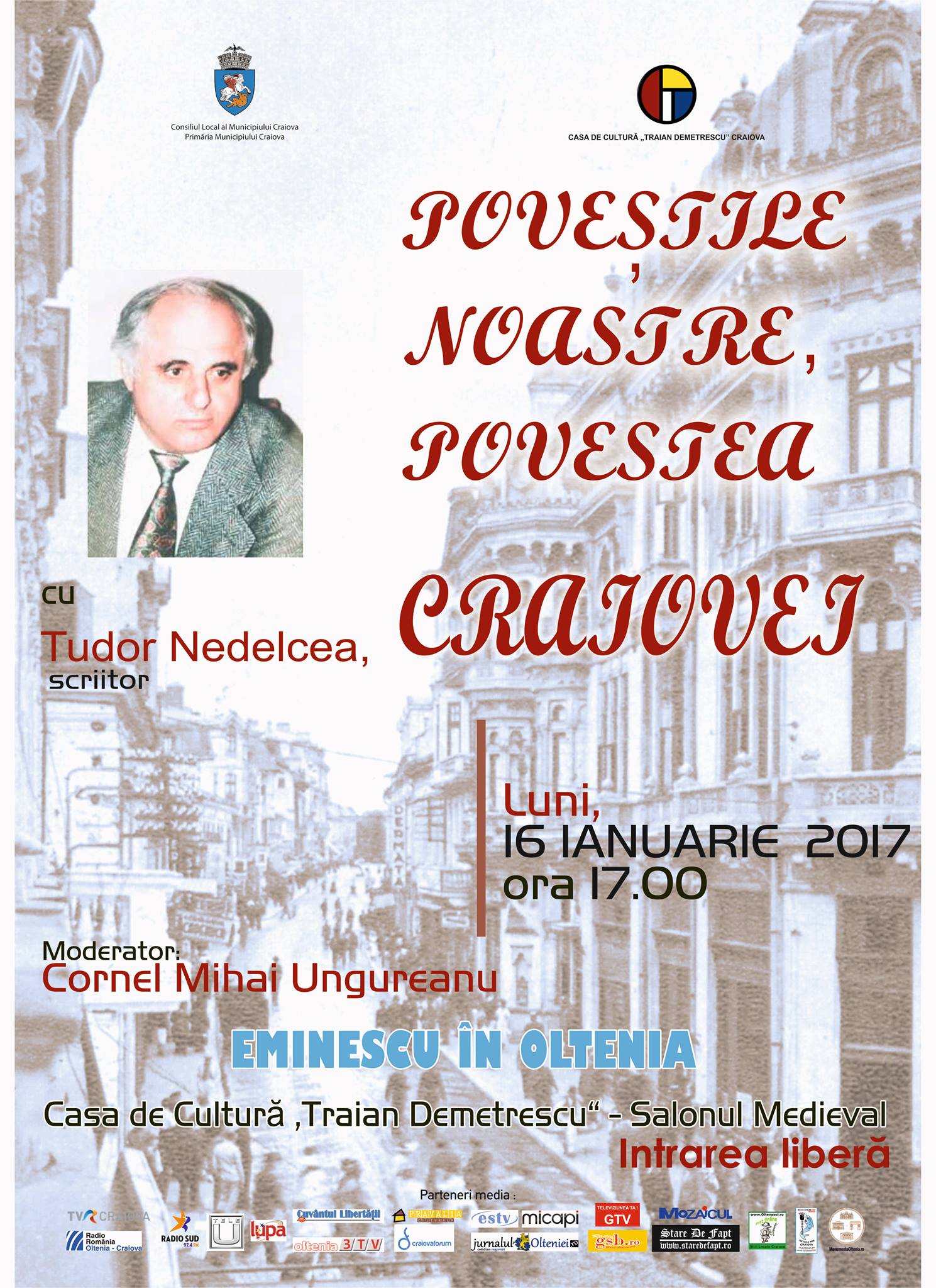 Casa de Cultură „Traian Demetrescu” organizează luni, 16 ianuarie 2017, de la ora 17.00, în Salonul Medieval al instituției, o nouă întâlnire din cadrul proiectului „Poveștile noastre, povestea Craiovei”. Invitat este scriitorul Tudor Nedelcea, care va evoca, în prima parte a manifestării, figura lui Mihai Eminescu, precum și prezența poetului național la Craiova. „Eminescu în Oltenia” se intitulează prelegerea pe care Tudor Nedelcea o va susține cu ocazia Zilei Culturii Naționale. În partea a doua a întâlnirii, invitatul va depăna amintiri despre Craiova de altădată, așa cum a cunoscut-o, va povesti întâmplări – mai mult sau mai puțin personale – în care se vor oglindi însă și imaginea orașului și schimbările prin care Craiova a trecut până în zilele noastre. După expunerea sa, Tudor Nedelcea va răspunde întrebărilor și va dialoga cu cei interesați. Moderator: Cornel Mihai Ungureanu. Intrarea este liberă.