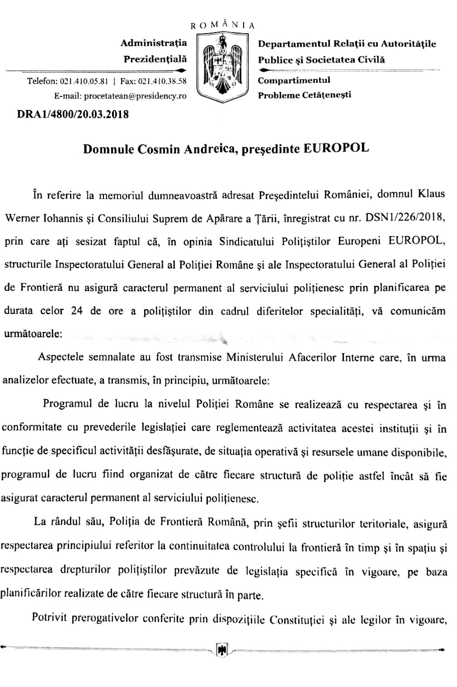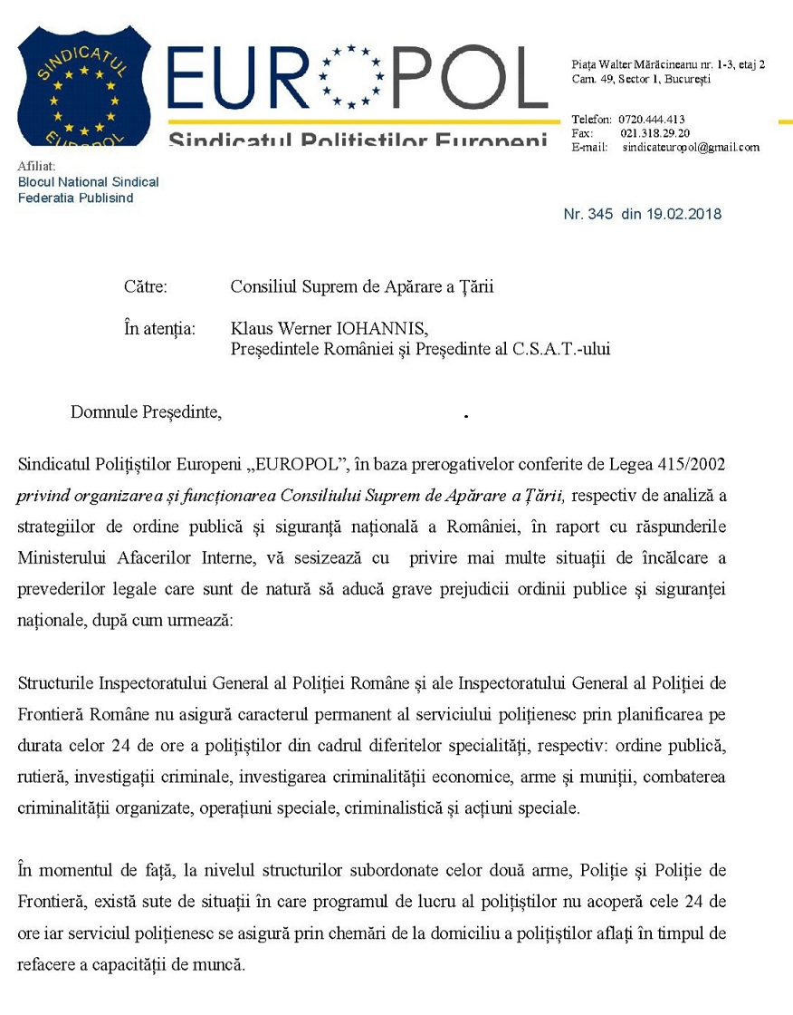 Despre aceste aspecte, reprezentanții Sindicatului EUROPOL au sesizat și Consiliul Suprem de Apărare a Țării, cu privire la nerespectarea obligațiilor art. 44 alin. 1 și 39 din Legea 360/2002 privind Statutul polițistului: