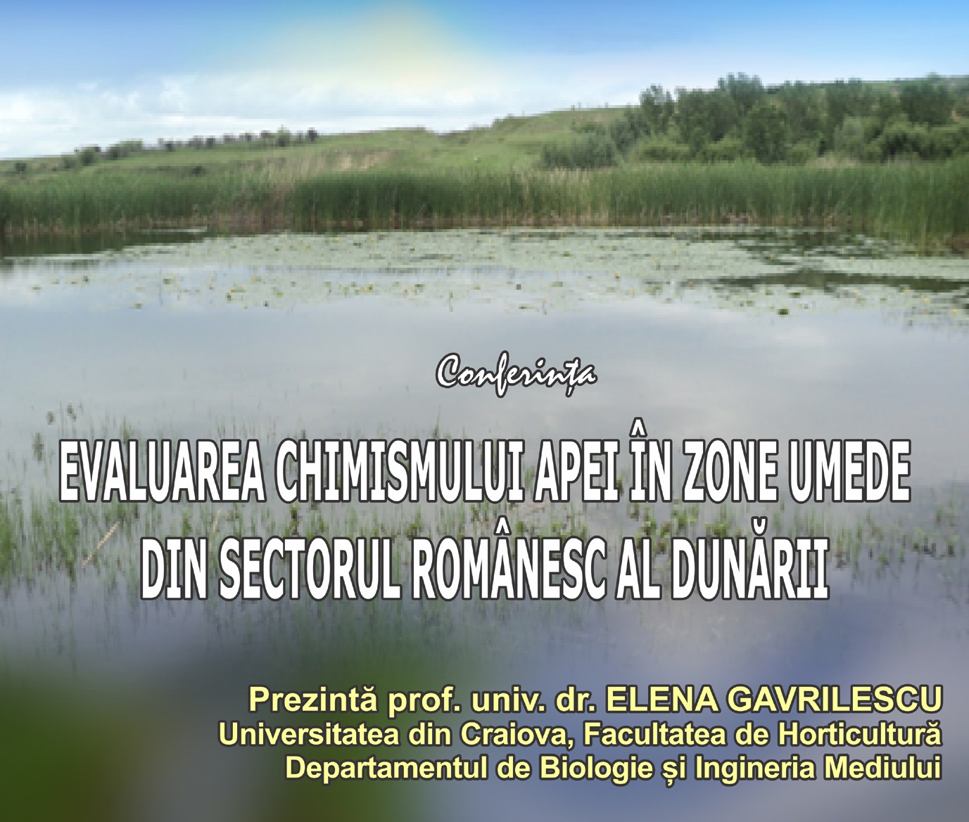 Conferința EVALUAREA CHIMISMULUI APEI ÎN ZONE UMEDE DIN SECTORUL ROMÂNESC AL DUNĂRII, va fi susținută de către profesor univ. dr. Elena Gavrilescu din cadrul Departamentului de Biologie și Ingineria Mediului a Facultăţii de Horticultură a Universităţii din Craiova, și va conține o serie de videoproiecții.
