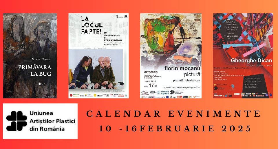 Luni, 10 februarie 2025, la ora 17.00, la Galeria ARTOTECA a Bibliotecii Metropolitane București (Șoseaua Mihai Bravu, nr. 4), va avea loc vernisajul expoziției Florin Mocanu-pictură. Este o selecție de lucrări realizate în ultimii ani, în care artistul își propune o reflecție asupra proceselor și procedeelor de transpunere a ideilor și a materialelor într-o opera semnificativă. Florin Mocanu s-a născut în Răsvani, Călărași, la 24 ianuarie 1963, și a absolvit, în 1997, Academiei de Artă, București, specializarea Pictură, la clasa profesorilor Alexandru Chira și Ștefan Câlția. Despre arta sa, în 2023, Luiza Barcan scria: „Florin Mocanu pune în acțiune, prin gestul său creator, un proces de sondare a acelui strat inaccesibil al ființei, unde viețuiesc potențialități dornice să iasă în lumină, într-o formă artistică aptă de comunicare cu privitorul. De aceea, nu lipsesc acele incitante structuri plastice, nici dezinhibiția față de culoarea saturată, față de culorile primare, așadar, nici spiritul ludic și, desigur, nici bucuria împărtășirii unei trăiri ardente și a comunicării nemijlocite cu spectatorul, după înțelegerea tacită, de către acesta din urmă, a invitației de a devenii părtaș la un spectacol vizual născut din trăire pură.” Expoziția poate fi vizitată până pe 7 martie 2025.
