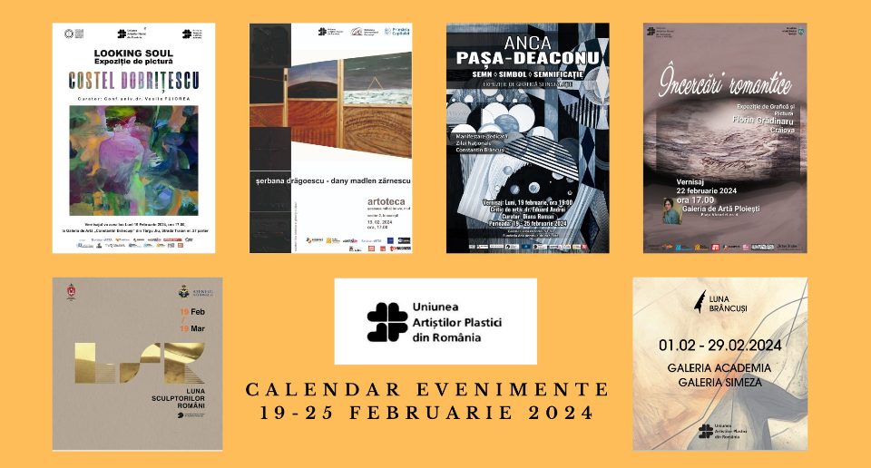 La ora 19:00 se va deschide la Galeria ”Calea Victoriei 91-93” din București, expoziția intitulată „Semn.Simbol.Semnificație.”, semnată de Anca Pașa Deaconu și curatoriată de Diana Roman. Prin proiectul 12, artista Anca Pașa Deaconu și-a propus să organizeze în diverse spații (galerii, muzee) un ciclu de douăsprezece expoziții personale de grafică. Al cincilea eveniment al seriei, organizat sub egida Fundației Ana pentru Cultură și Artă, se alătură evenimentelor dedicate Zilei Naționale ”Constantin Brâncuși”, iar expoziția va putea fi vizitată până pe 25 februarie 2024.