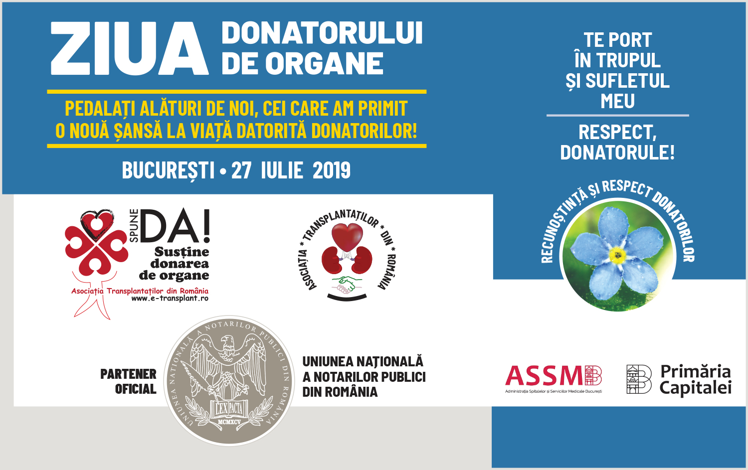 Asociatia Transplantatilor din Romania va invita sambata 27 iulie 2019, la ora 9.30 la deschiderea activitatilor ocazionate de Ziua Donatorului de organe, la Spitalul Sf. Maria, sala Amfiteatru, si apoi la ora 11.00, la confernita de presa care va avea loc la IC Fundeni, in curtea bisericii cu hramul „Sfintii doctori fara de arginti Cosma si Damian”.
