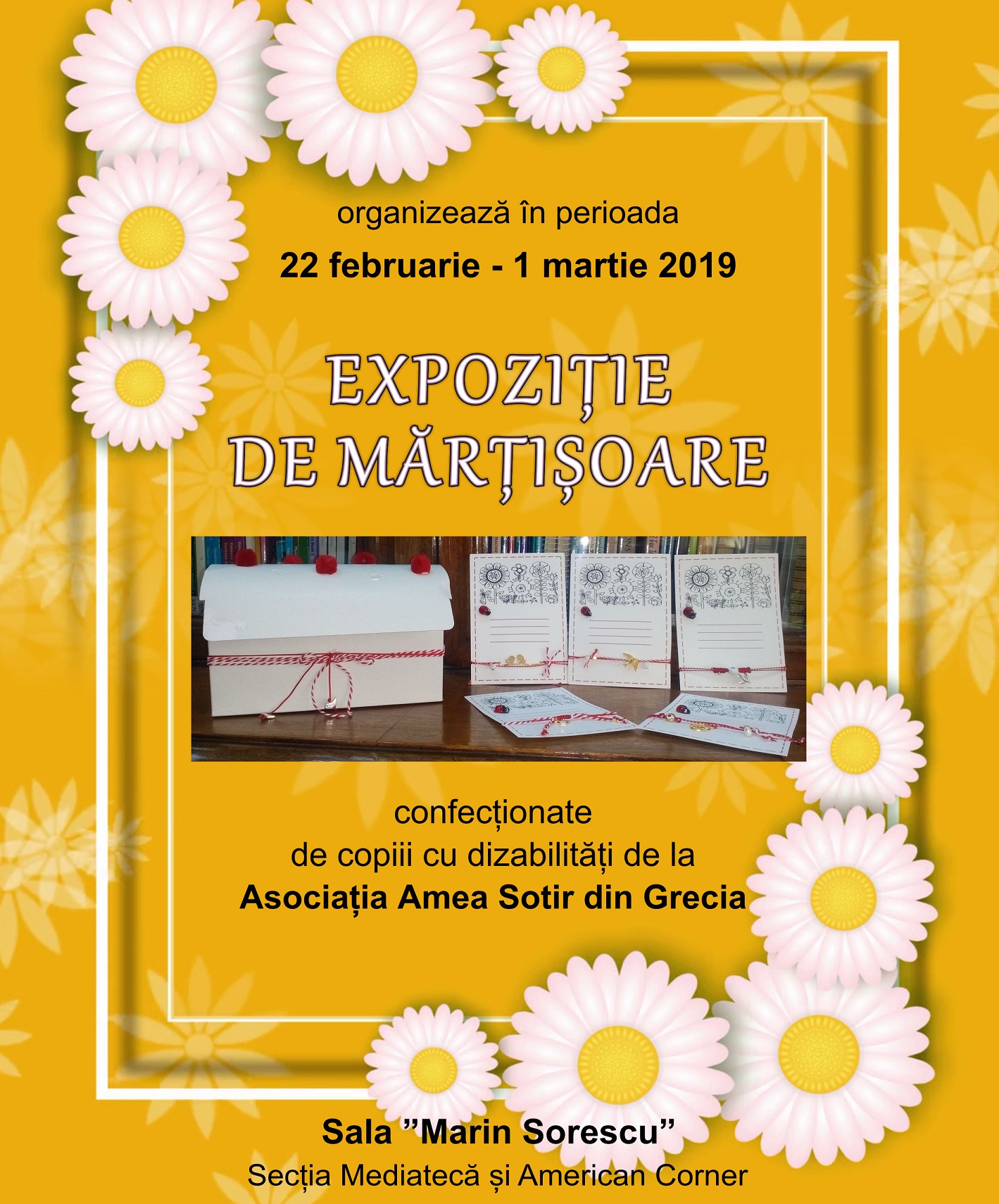 Biblioteca Județeană „Alexandru și Aristia Aman” organizează, în perioada 22 februarie – 1 martie 2019, în sala „Marin Sorescu”, expoziția de mărțișoare tradiționale realizate de persoanele cu nevoi speciale de la Asociația „Amea Sotir” din Salonic, Grecia.