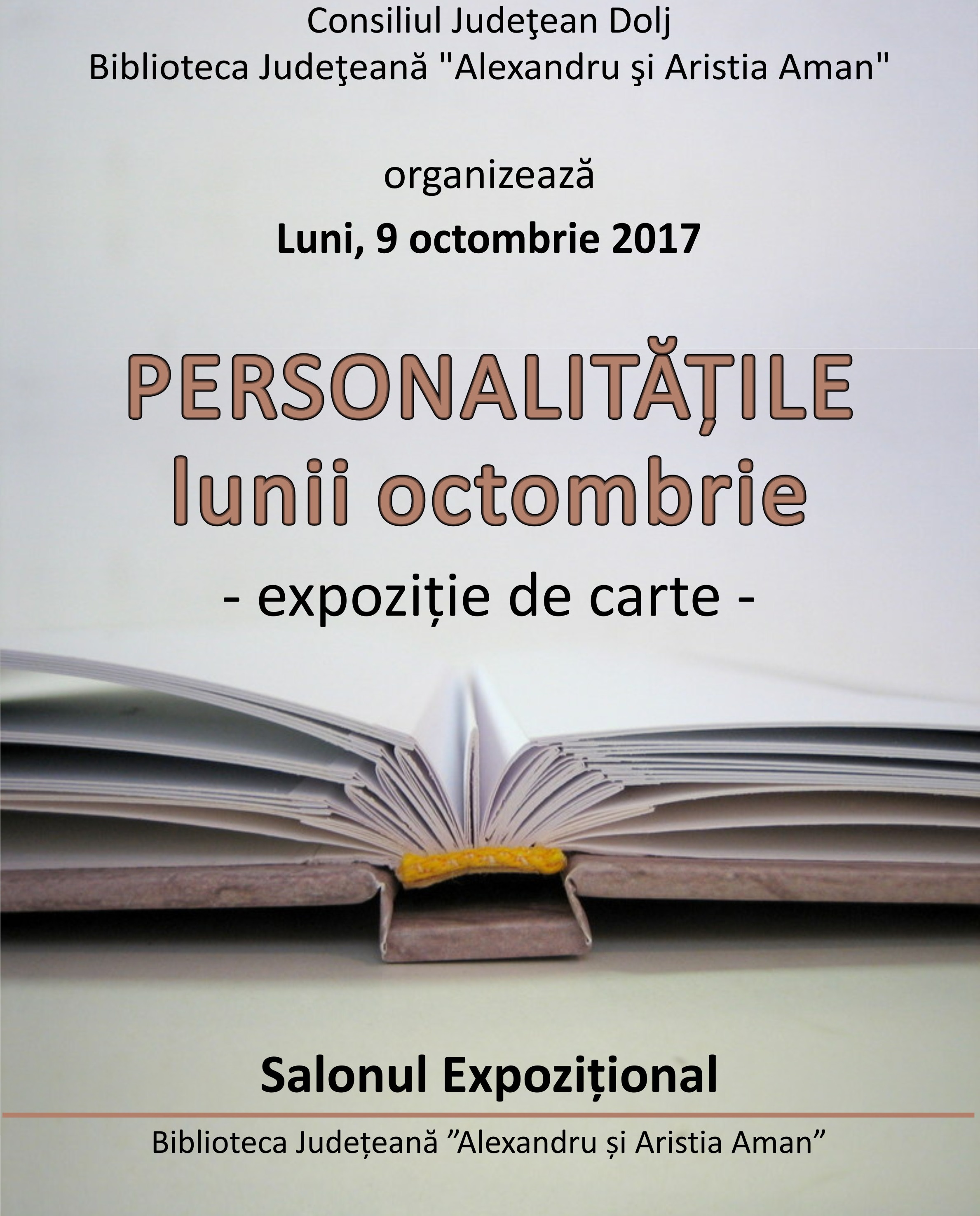 Luni, 9 octombrie 2017, Biblioteca Județeană „Alexandru și Aristia Aman” vă invită la deschiderea expoziției de carte „Personalitățile lunii octombrie”. Vor fi expuse scrieri despre, sau ale următorilor autori: Dimitrie Cantemir, Simion Mehedinți, Ștefan Petică, Mihail Sadoveanu, Agatha Grigorescu-Bacovia, Zaharia Stancu, Mircea Vulcănescu, Cella Serghi. Prin această expoziție de carte se dorește trecerea în revistă a operelor unor personalități marcante ale țării noastre.