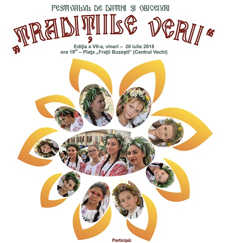 Consiliul Judeţean Dolj şi Centrul Judeţean pentru Conservarea şi Promovarea Culturii Tradiţionale Dolj, cu sprijinul Primăriei şi al Consiliului Local Municipal Craiova – parteneri ai evenimentului, organizează vineri, 20 iulie 2018, începând cu ora 19:00, Festivalul de datini şi obiceiuri „Tradiţiile verii“, ediţia a VII-a, în Piaţa Fraţii Buzeşti (Centrul Vechi).