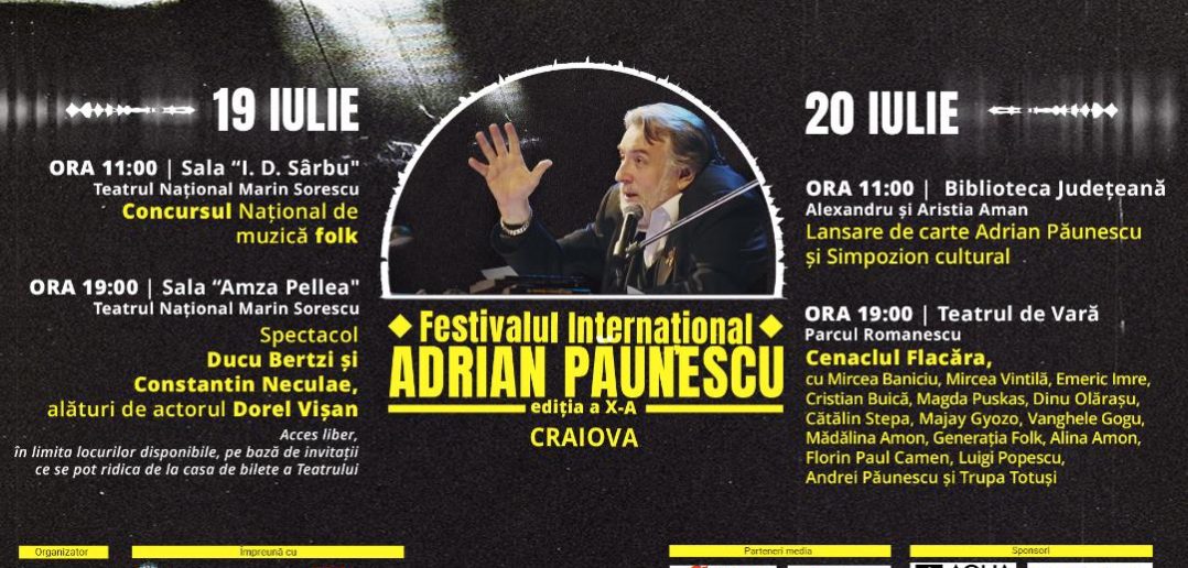 Fundația Culturală Iubirea, împreună cu Primăria Municipiului Craiova, Consiliul Local și Consiliul Județean Dolj, organizează pe 19 și 20 iulie 2024, ediția a X-a a Festivalului Internațional Adrian Păunescu, contând pe revista „Flacăra lui Adrian Păunescu”.