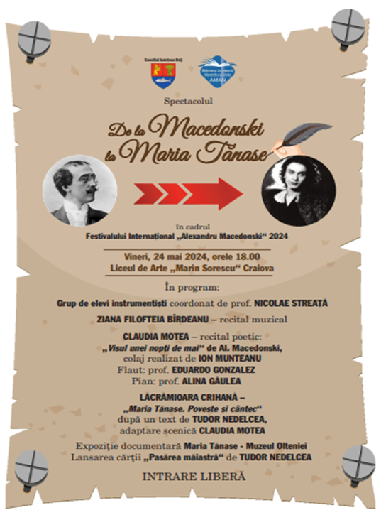 ora 18.00 – sala de festivități a Liceului de Arte „Marin Sorescu” din Craiova, spectacolul „De la Macedonski la Maria Tănase”. Actrița Claudia Motea (București), acompaniată la flaut de Eduardo Gonzalez și pian de Alina Găulea (Craiova), ne va purta pe aripile unui „vis de mai”, recitând poeme din creația lui Alexandru Macedonski (colaj realizat de Ion Munteanu), iar  mezzosoprana Lăcrămioara Crihană (de la Teatrul Național de Operă și Operetă „Nae Leonard” din Galați), pe un scenariu al scriitorului Tudor Nedelcea, va glăsui în note de aur povestea vieții marii noastre artiste populare. Își mai dau concursul: solista de muzică populară Ziana Filofteia Bîrdeanu (Drobeta Turnu-Severin) și un grup de artiști instrumentiști, elevi ai liceului gazdă.