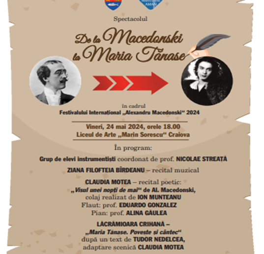ora 18.00 – sala de festivități a Liceului de Arte „Marin Sorescu” din Craiova, spectacolul „De la Macedonski la Maria Tănase”. Actrița Claudia Motea (București), acompaniată la flaut de Eduardo Gonzalez și pian de Alina Găulea (Craiova), ne va purta pe aripile unui „vis de mai”, recitând poeme din creația lui Alexandru Macedonski (colaj realizat de Ion Munteanu), iar  mezzosoprana Lăcrămioara Crihană (de la Teatrul Național de Operă și Operetă „Nae Leonard” din Galați), pe un scenariu al scriitorului Tudor Nedelcea, va glăsui în note de aur povestea vieții marii noastre artiste populare. Își mai dau concursul: solista de muzică populară Ziana Filofteia Bîrdeanu (Drobeta Turnu-Severin) și un grup de artiști instrumentiști, elevi ai liceului gazdă.