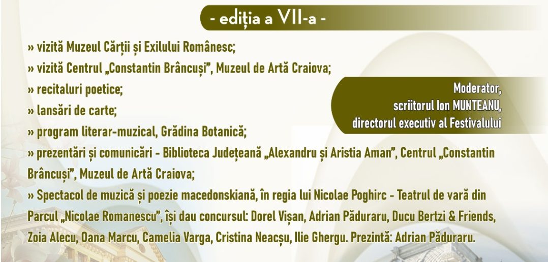 La Craiova, în perioada 22 – 24 mai 2025, sub egida Consiliului Județean Dolj, Biblioteca Județeană „Alexandru și Aristia Aman”, în parteneriat cu Muzeul Cărții și Exilului Românesc, Muzeul de Artă, Centrul Național „Constantin Brâncuși”, Compartimentul Casei de cultură „Traian Demetrescu” al Teatrului Colibri, Teatrul Național „Marin Sorescu” și Asociația Culturală „Alexandru Macedonski”, organizează cea de-a VII-a ediție a Festivalului Internațional „Alexandru Macedonski”.