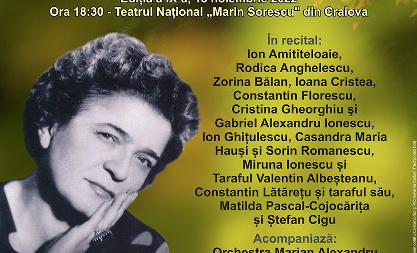 Centrul Judeţean pentru Conservarea şi Promovarea Culturii Tradiţionale Dolj, cu sprijinul Consiliului Județean Dolj, organizează, marți, 15 noiembrie 2022, începând cu ora 18:30, Festivalul Naţional „Ioana Radu“ – ediţia a IX-a. Evenimentul este găzduit de Teatrul Național „Marin Sorescu“ din Craiova.