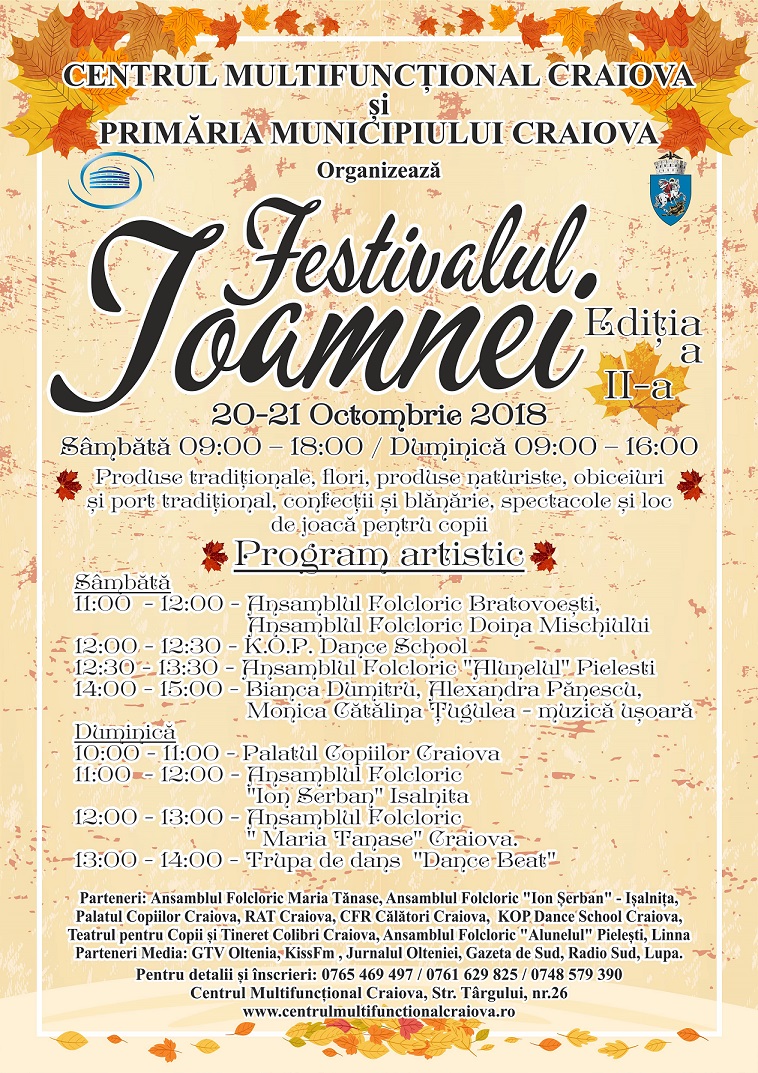 Centrul Multifuncțional Craiova organizează în colaborare cu Primăria Municipiului Craiova, în perioada 20 – 21 octombrie 2018, FESTIVALUL TOAMNEI, ediția a-II-a.