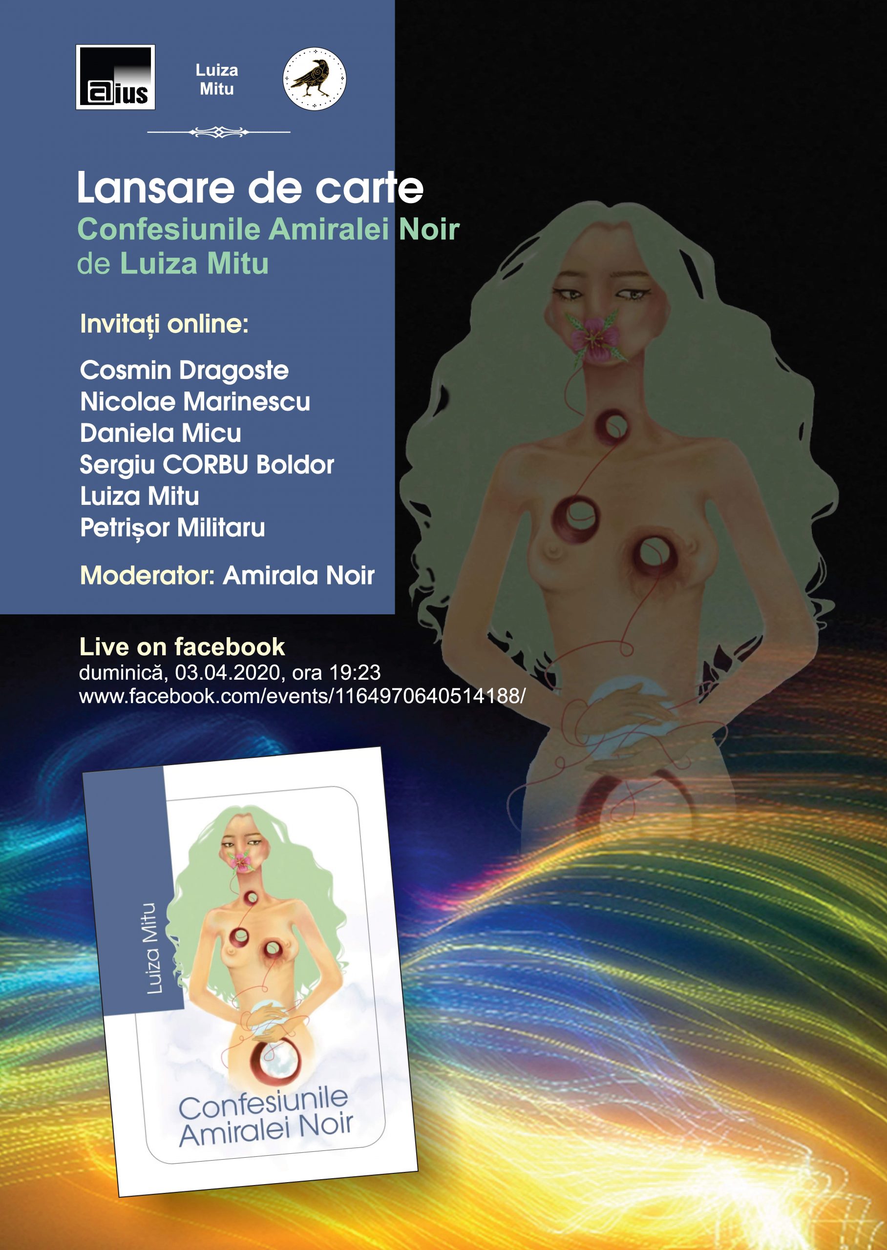 Invitați online vor fi conf. univ. dr. Cosmin Dragoste, directorul Editurii Aius, Nicolae Marinescu, criticul literar Daniela Micu, liderul Proiectului Muzical Corbu, Sergiu CORBU Boldor, criticul litarar Petrișor Militaru, autoarea cărții, Luiza Mitu. Evenimentul va fi moderat de personajul fictiv Amirala Noir.