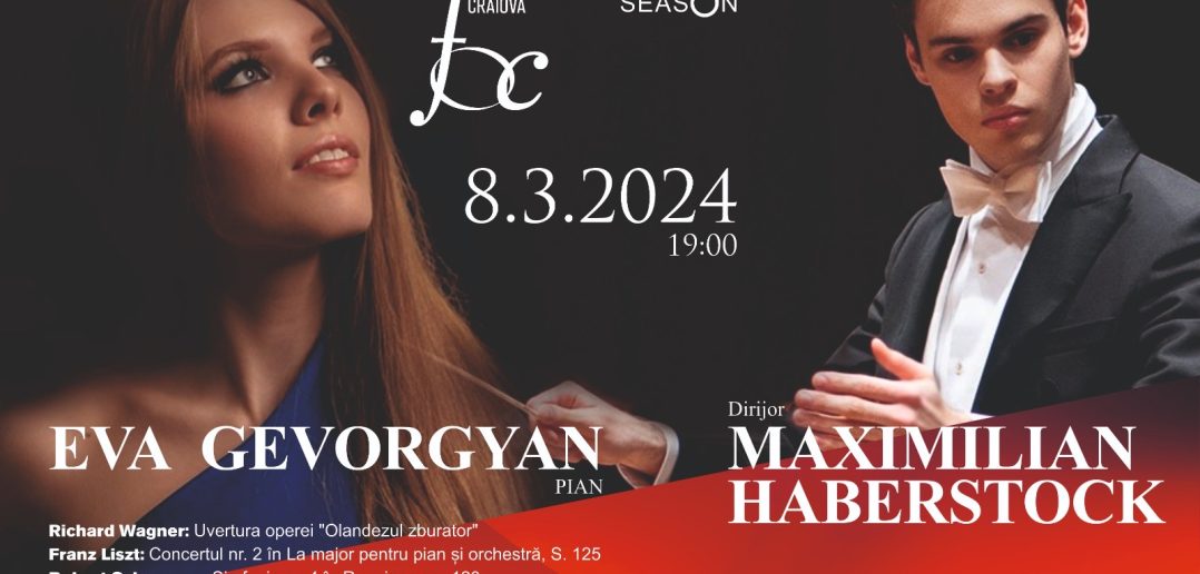 Filarmonica „Oltenia” pregătește publicului meloman un eveniment muzical dedicat Zilei Femeii, sub bagheta dirijorului german Maximilian Haberstock și cu participarea solistei Eva Gevorgyan. Concertul va avea loc la în sala de concerte a Filarmonicii Oltenia vineri, 8 martie 2024, de la ora 19:00.