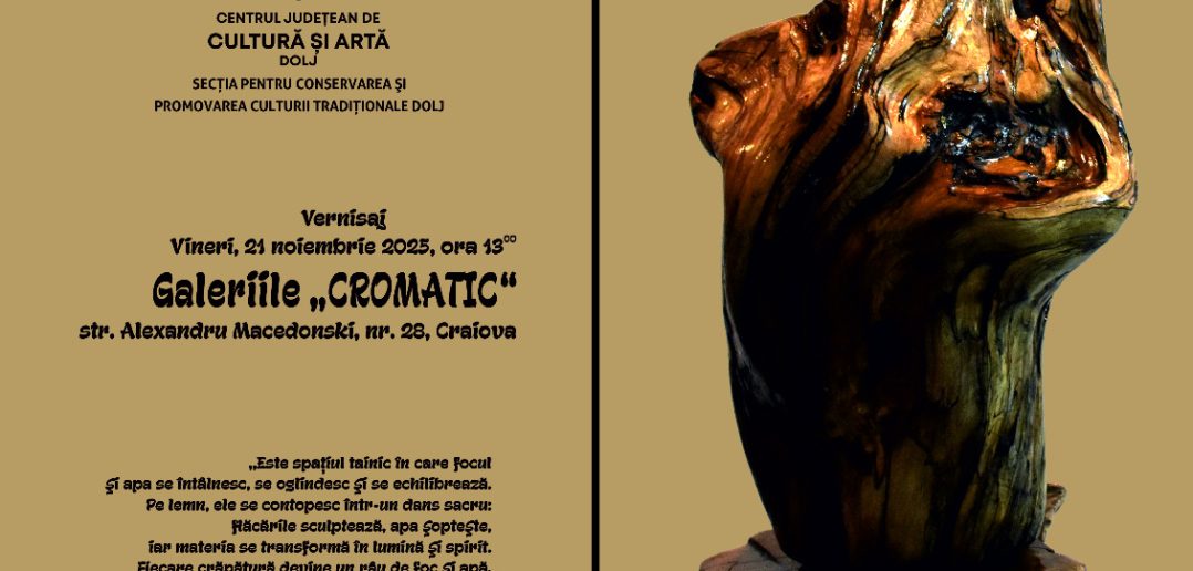 Centrul Județean de Cultură și Artă Dolj – Secția pentru Conservarea şi Promovarea Culturii Tradiționale Dolj vernisează vineri, 21 noiembrie 2025, ora 13:00, în Galeriile „Cromatic“, expoziția „Alchimie – foc apă“, semnată Mirela Cerasela Bradea.