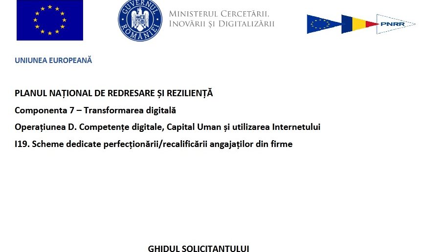 Ghidul se adresează solicitanților care doresc să obțină fonduri europene din Planul Național de Redresare și Reziliență – Componenta C7 în vederea administrării de proiecte în cadrul apelului aferent Investiției I 19: „Scheme dedicate perfecționării/recalificării angajaților din firme”.